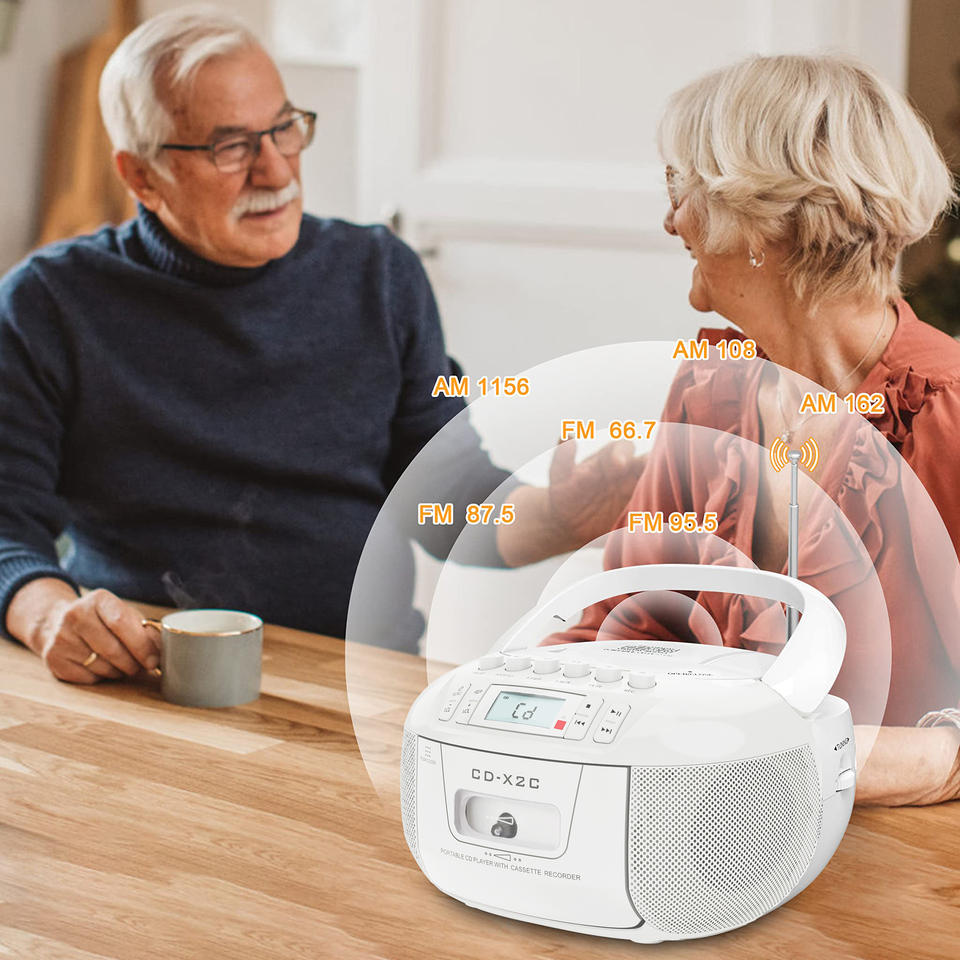 Reproductor de CD Portátil con Lector de Tarjetas USB y SD, Reproducción de MP3, Función BT, Radio FM, Blanco
