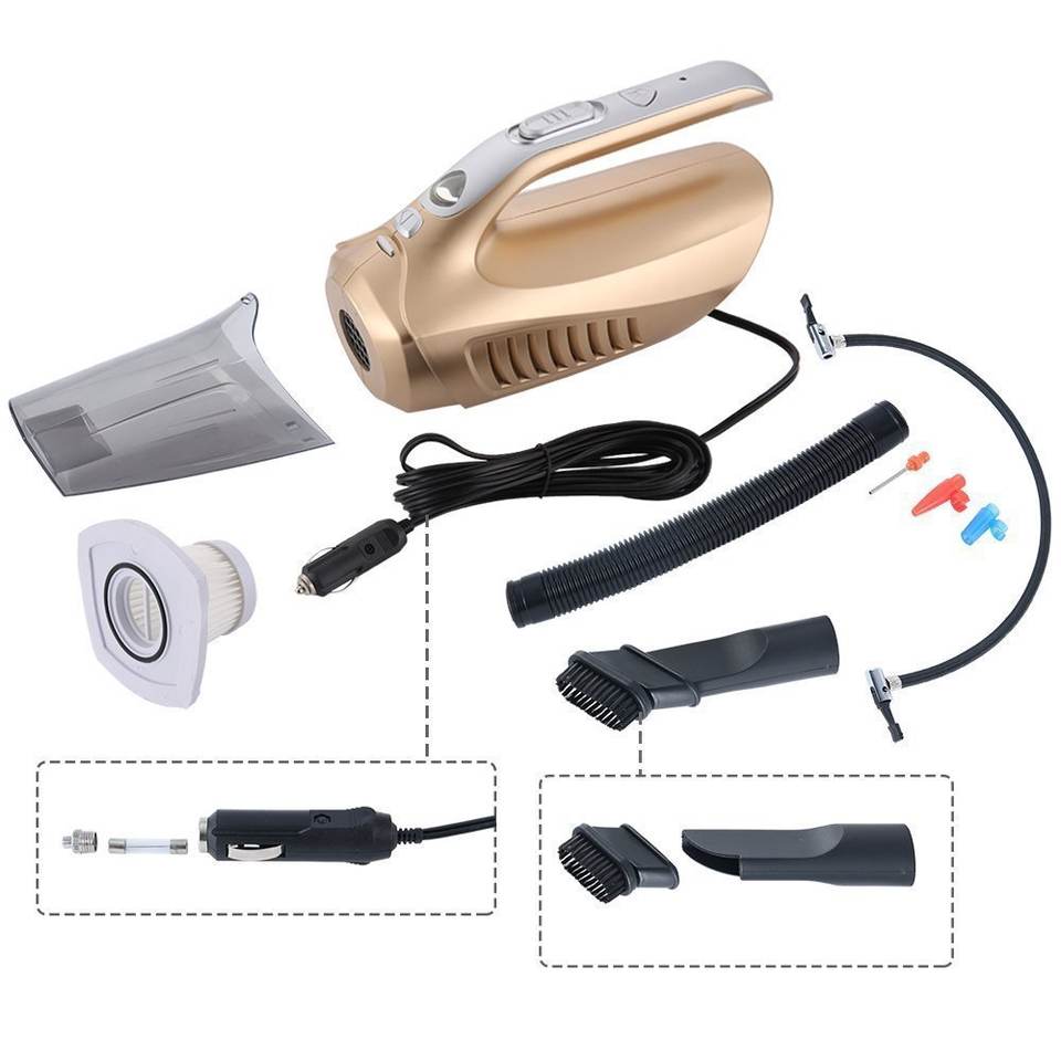 Aspiradora portátil para coche con bomba de aire, funciona con batería de 12V, diseño con cable en color dorado para limpieza de automóviles.