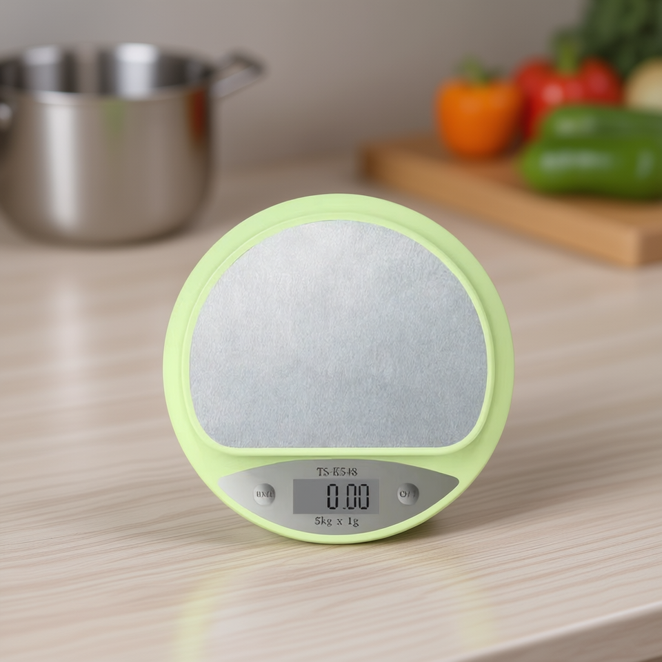 Báscula Digital de Cocina Young Electronicos, 5 kg x 1 g, Pantalla LCD, Portátil, de Acero Inoxidable, Forma Redonda