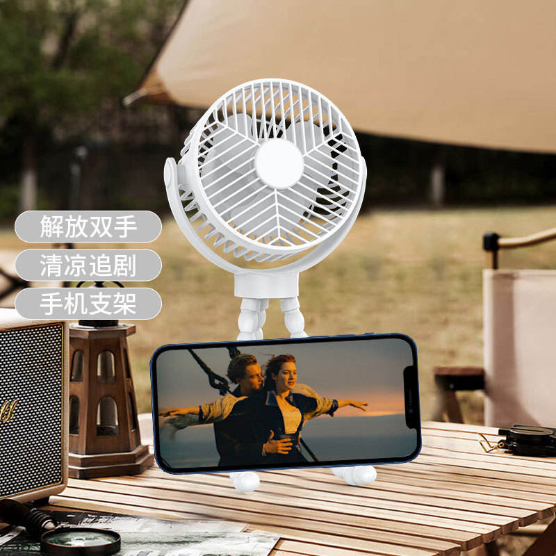 Ventilador Portátil con Soporte para Teléfono, Recargable por USB, 12 Horas de Duración de Batería, Refrigeración Manos Libres para Exteriores, Blanco