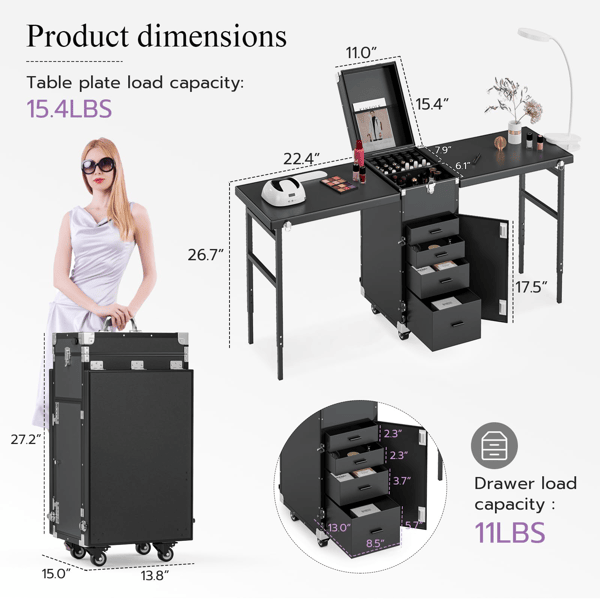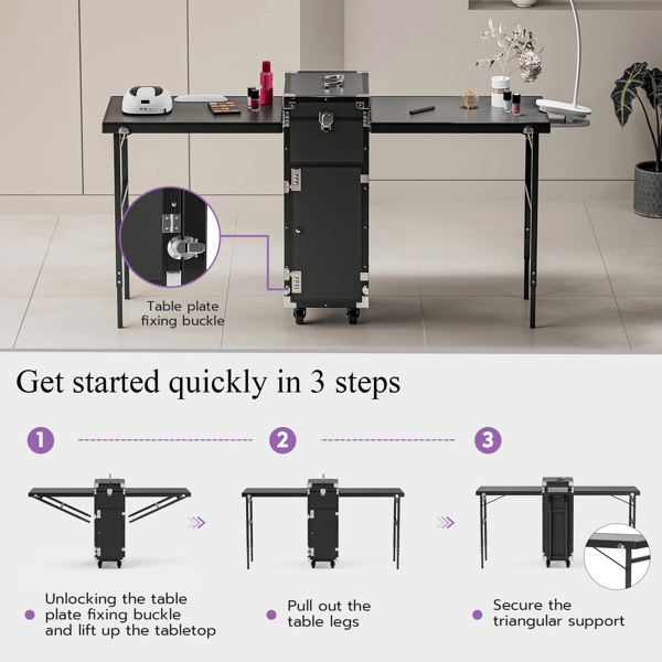 Mesa de Manicura Portátil Plegable con Ruedas, 2 Superficies de Trabajo, Carrito de Maquillaje, Estuche de Cosméticos, Mesa de Manicura con Ruedas para Enseñanza de Uñas