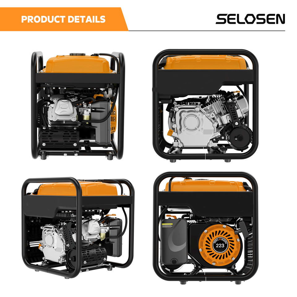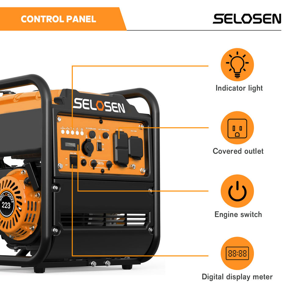 Generador Inverter Portátil con Protección CO, Energía Segura para Autocaravanas, 4500W de Potencia Máxima, 3800W de Funcionamiento, con Motor de Gasolina SELOSEN de 223cc Confiable