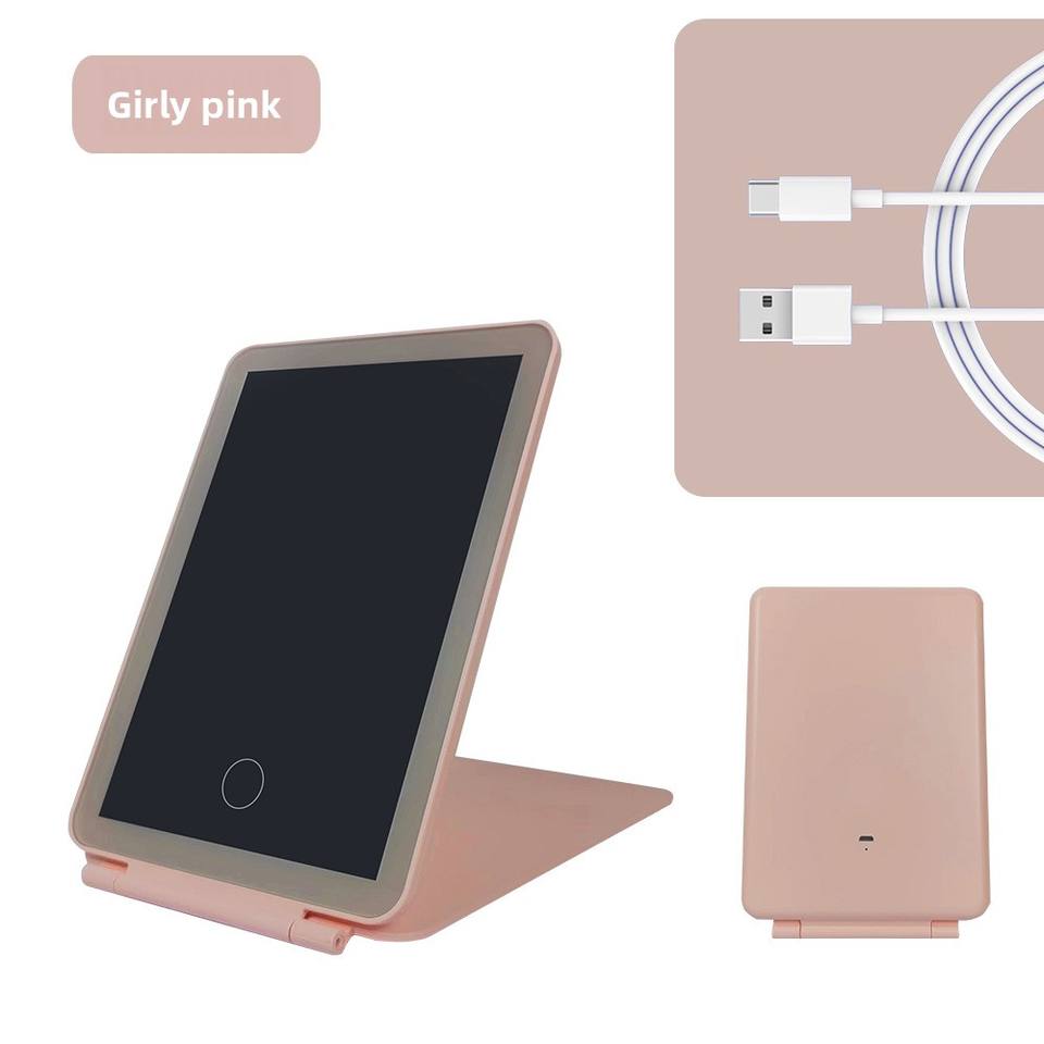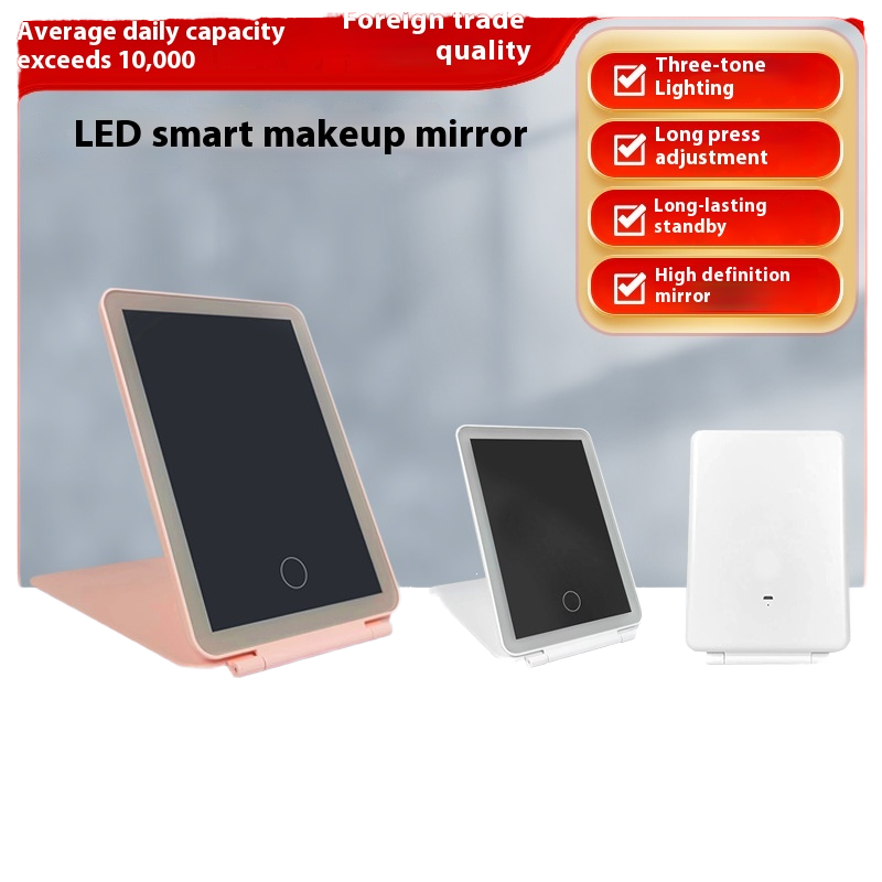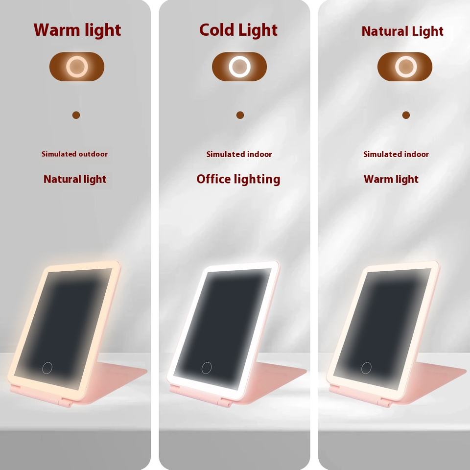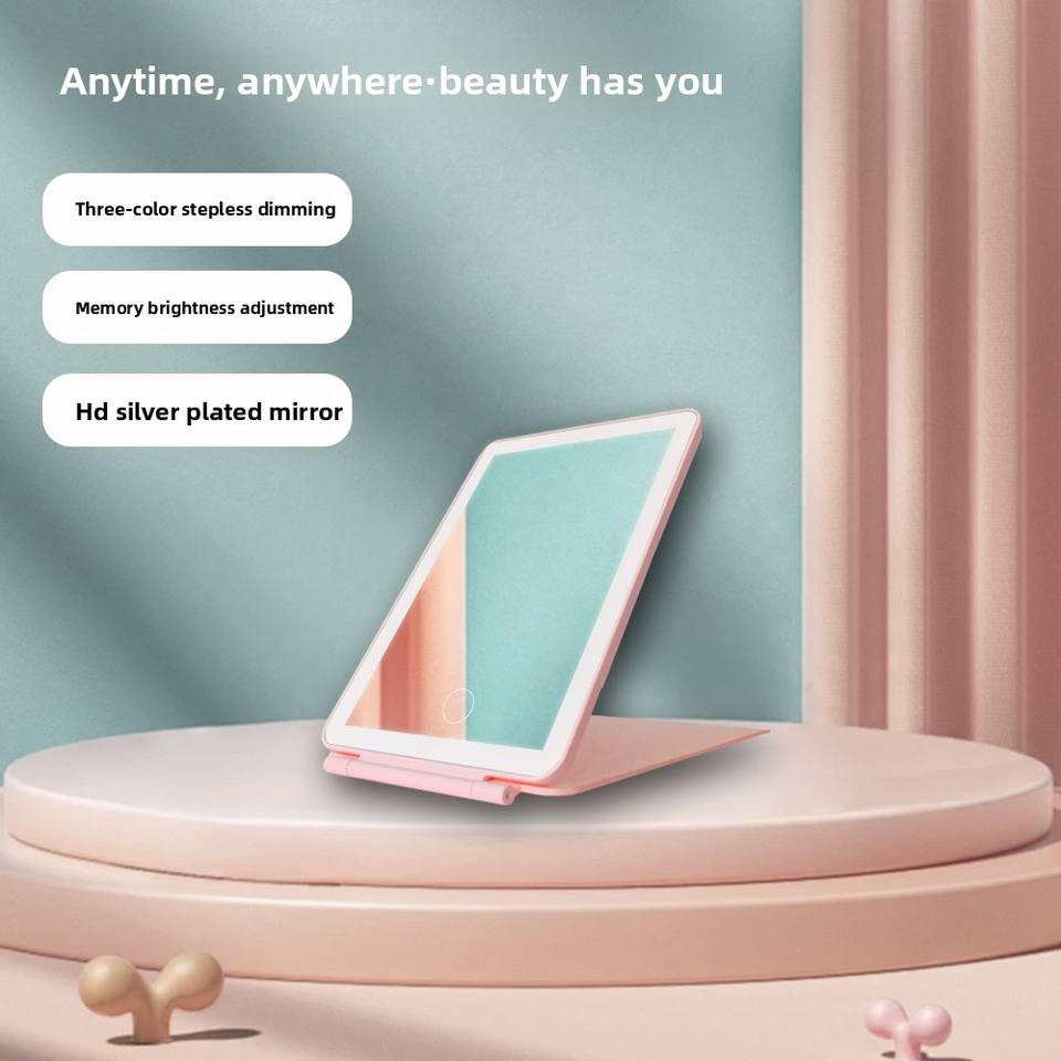 Espejo de tocador de maquillaje de escritorio LED portátil Nuevo diseño plegable plano con función de luz de relleno de doble cara para uso en dormitorio