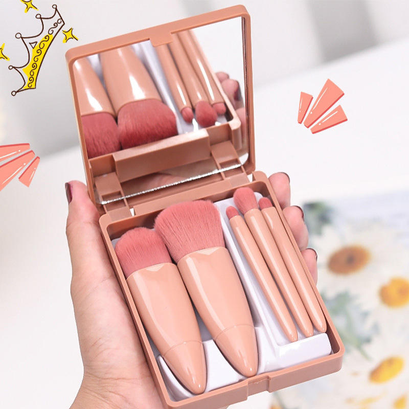 Juego de brochas de maquillaje portátiles, 5 piezas, pelo sintético, mango de plástico con espejo, estuche de viaje para aplicación de base