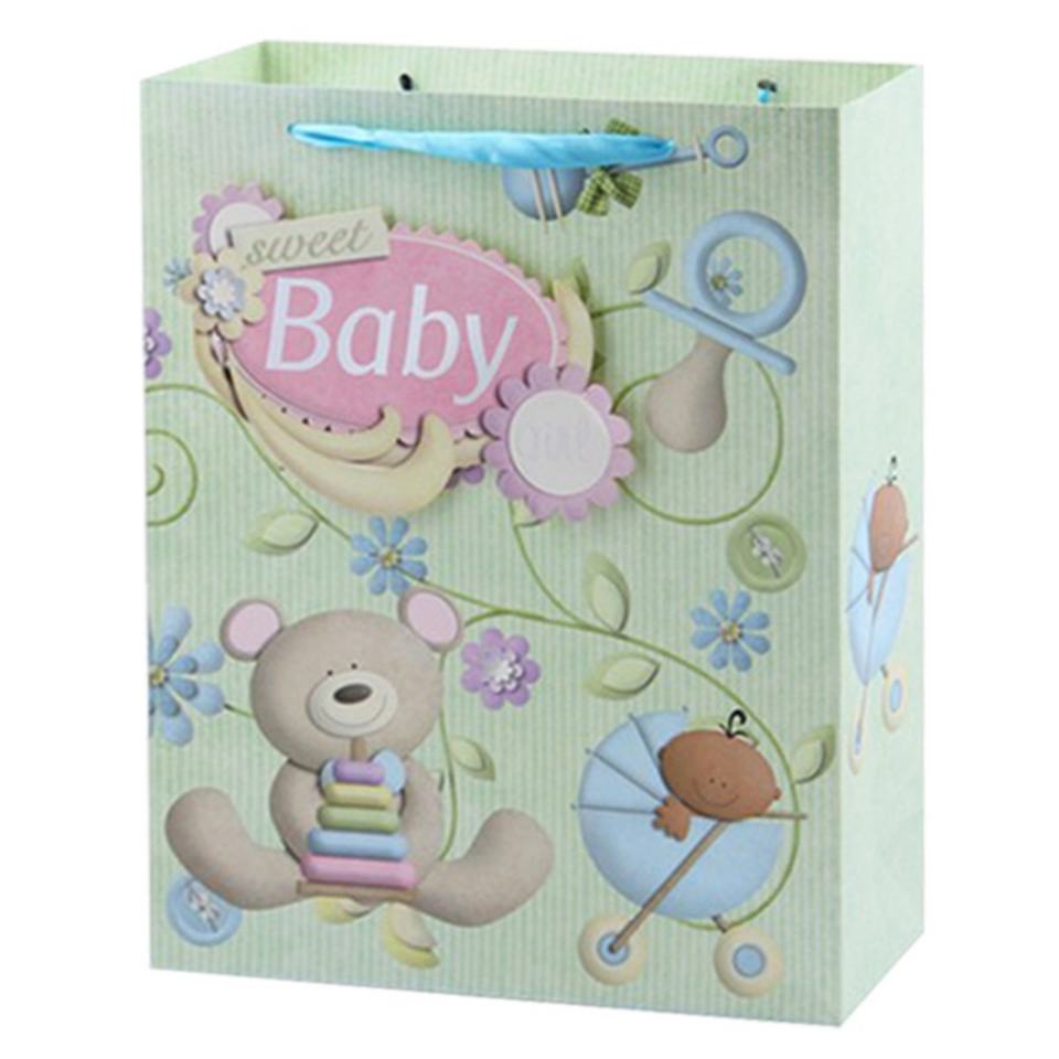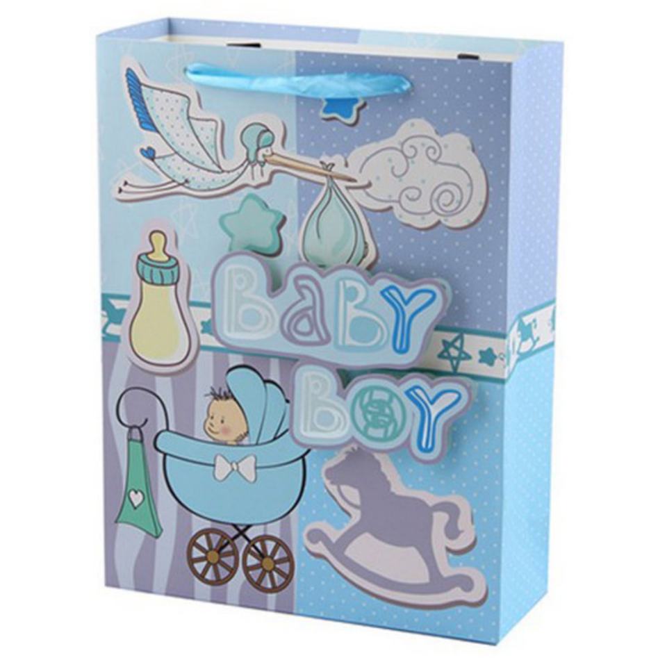 Bolsa de Papel para Regalo de Bebé con Diseño Impreso, Asas de Listón y Cartón Color Marfil, para Venta al Por Mayor