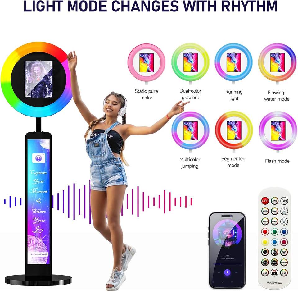 Soporte Portátil para Cabina de Fotos Compatible con Software, Aplicación y Control Remoto, Luces de Anillo RGB con Sincronización Musical