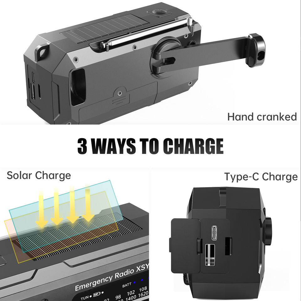 Método de carga:USB-C, Solar, Manivela