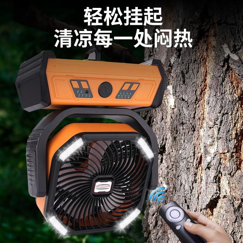 Ventilador portátil recargable para exteriores con luz, cabezal oscilante y 12 horas de duración de batería para uso en tiendas de campaña.