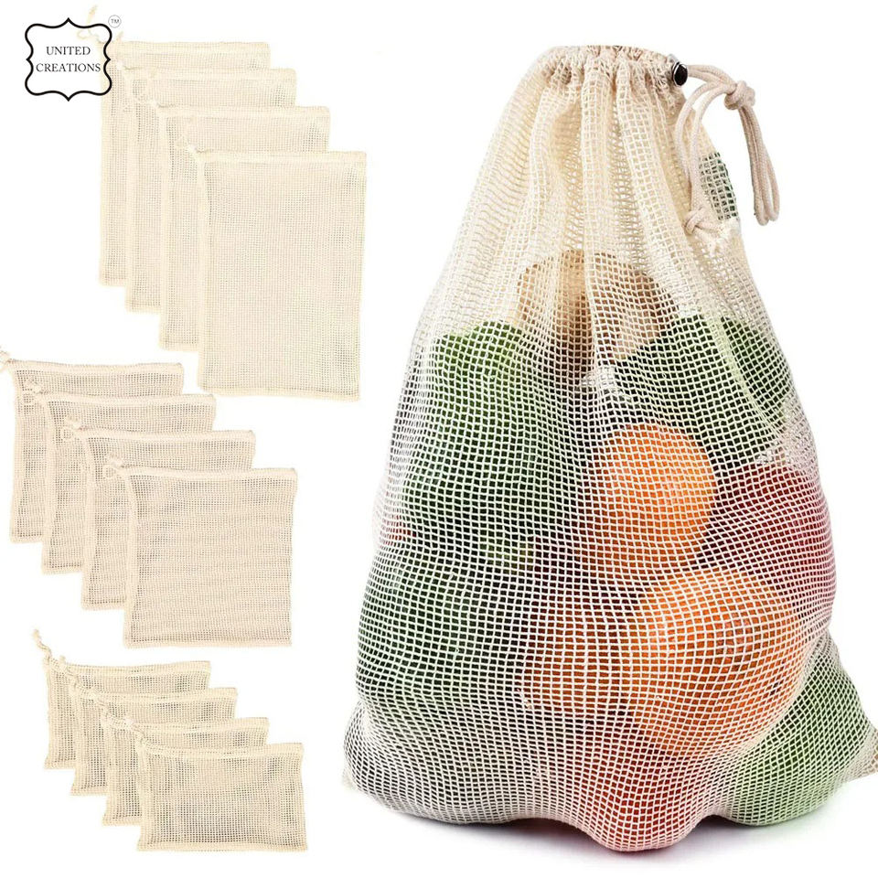 Bolso de cadena de malla de algodón reutilizable portátil con asa corta, bolso de compras reciclable para frutas y verduras