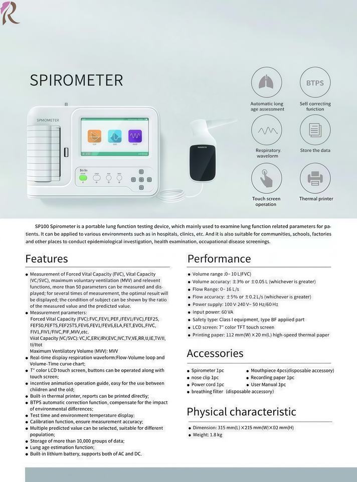 Lung Function Testing, Forced Vital Capacity (FVC) Measurement, Vital Capacity (VC/SVC) Measurement, Maximum Voluntary Ventilation (MVV) Measurement, Respiratory Waveform Display, Flow-Volume Loop & Volume-Time Curve Display, Automatic Age Estimation, BTPS Automatic CorrectionCaracterística