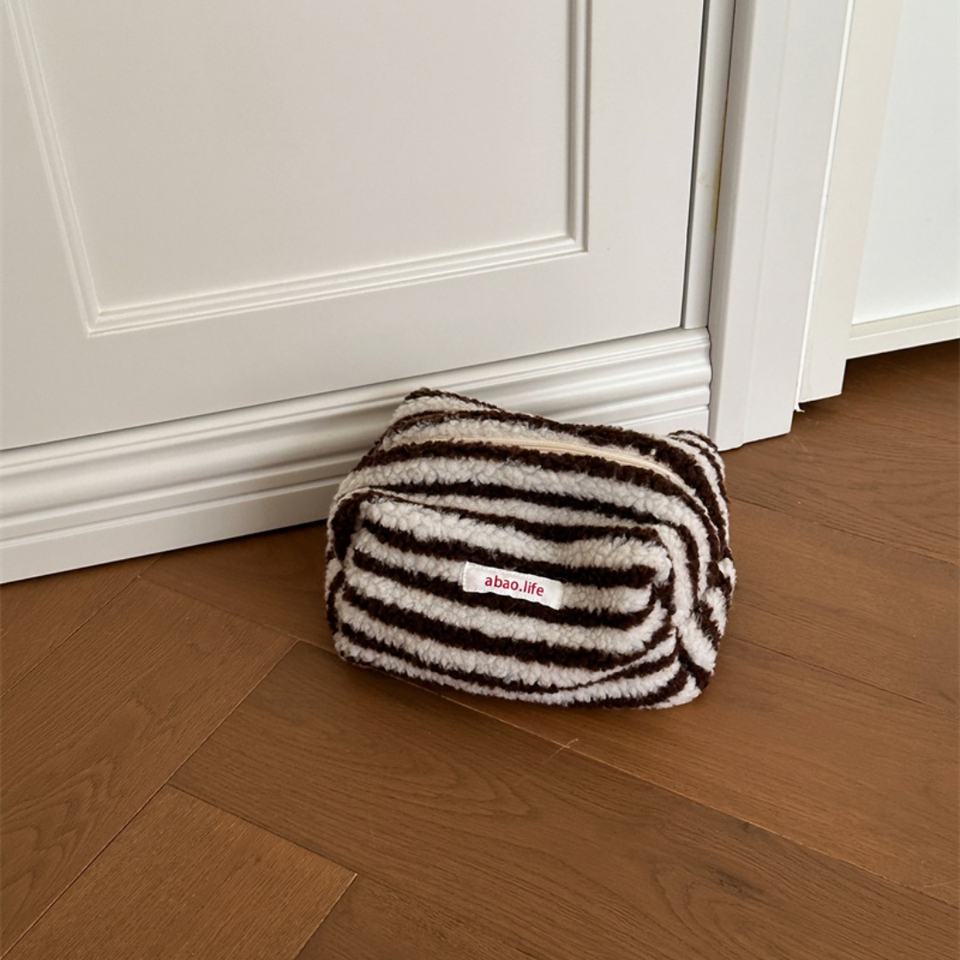 Neceser portátil, neceser de lana de cordero con rayas múltiples, etiqueta lavable, relleno de algodón suave para invierno