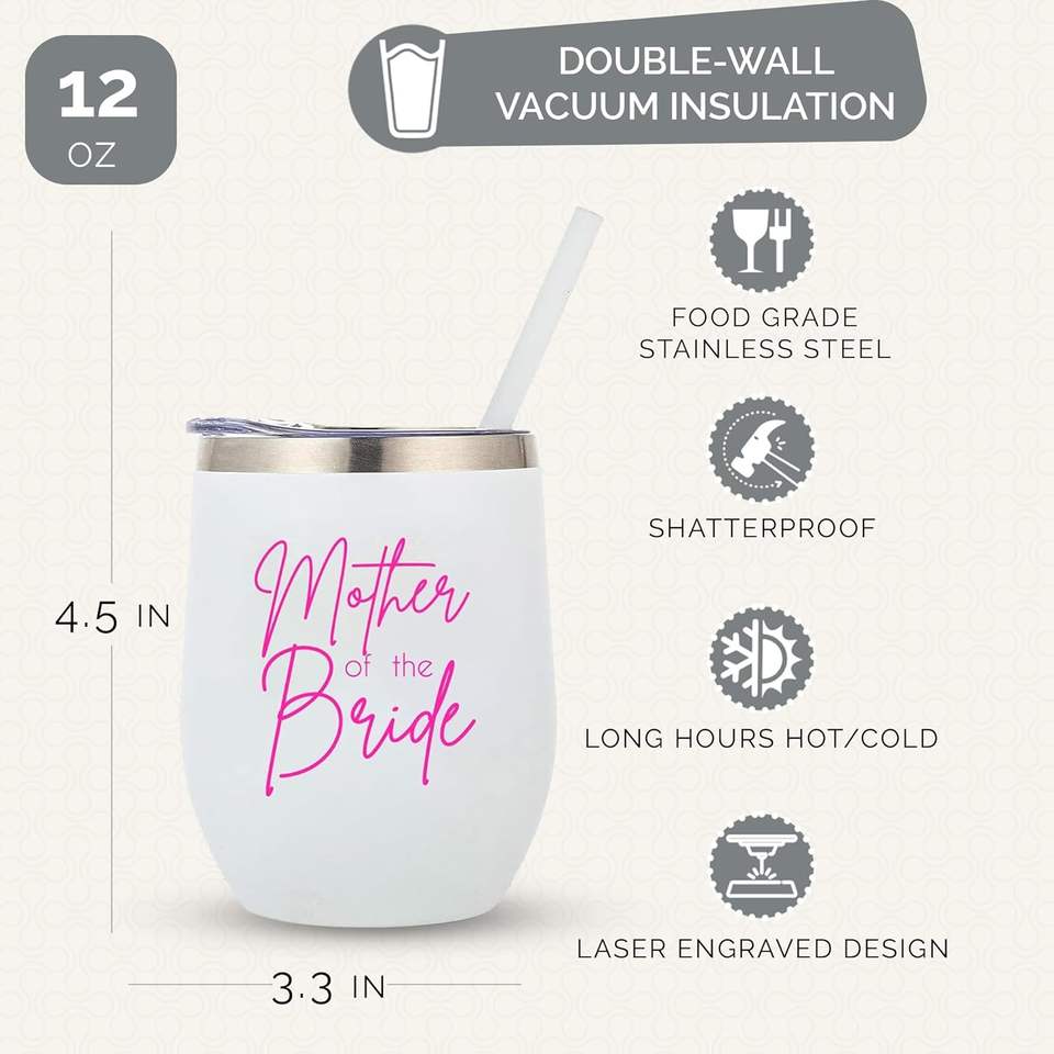 Vaso de vino para madre de la novia de acero inoxidable de doble pared de 12oz con recubrimiento en polvo con tapa y pajita, regalos de hija