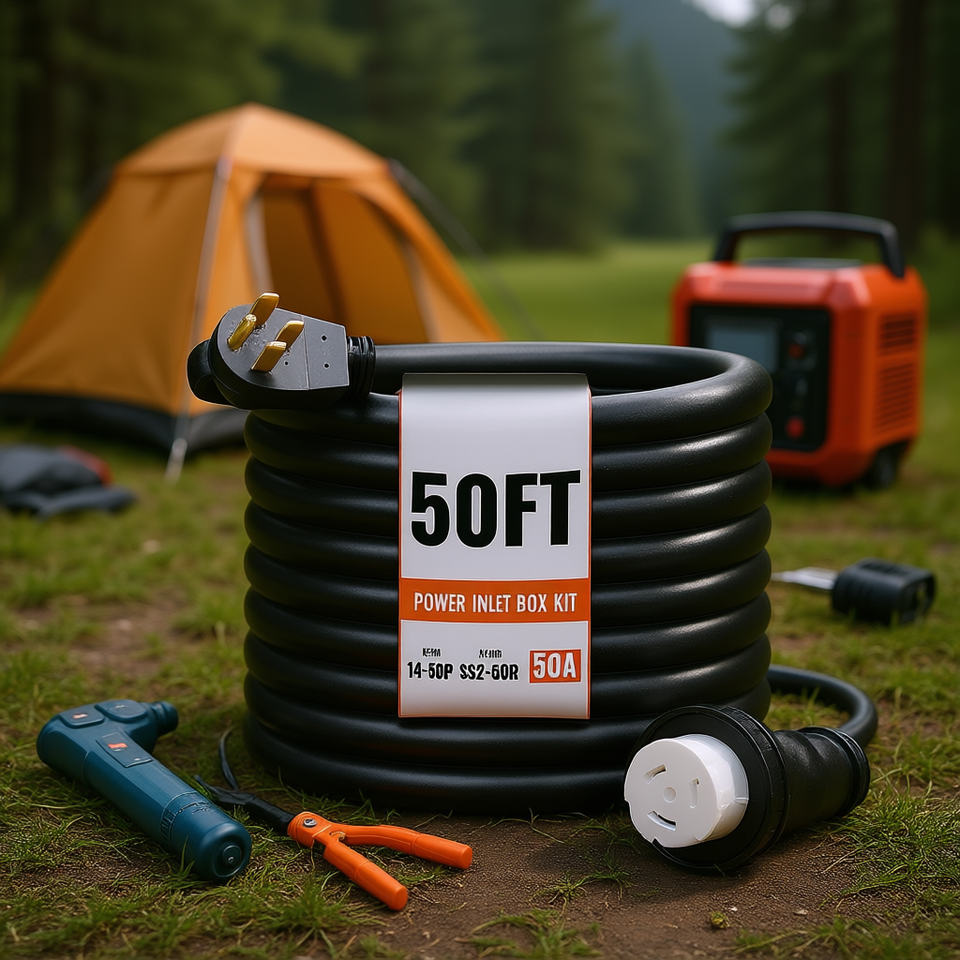 Kit de Caja de Entrada de Energía con Cable STW de 50 Pies y 50A, Cable de Goma para Generador, Conector Nema con Bloqueo Giratorio, Caja Preperforada