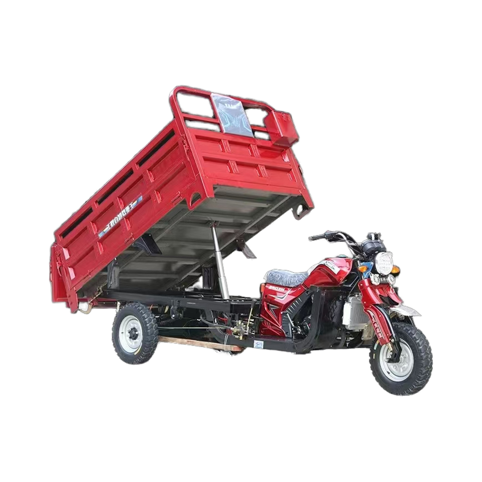 Potente triciclo motorizado a gasolina de tres ruedas con carrocería abierta y descarga automática, camión volquete de carga pesada de alta potencia
