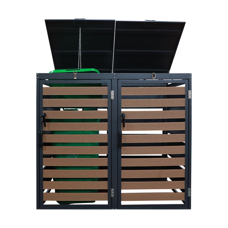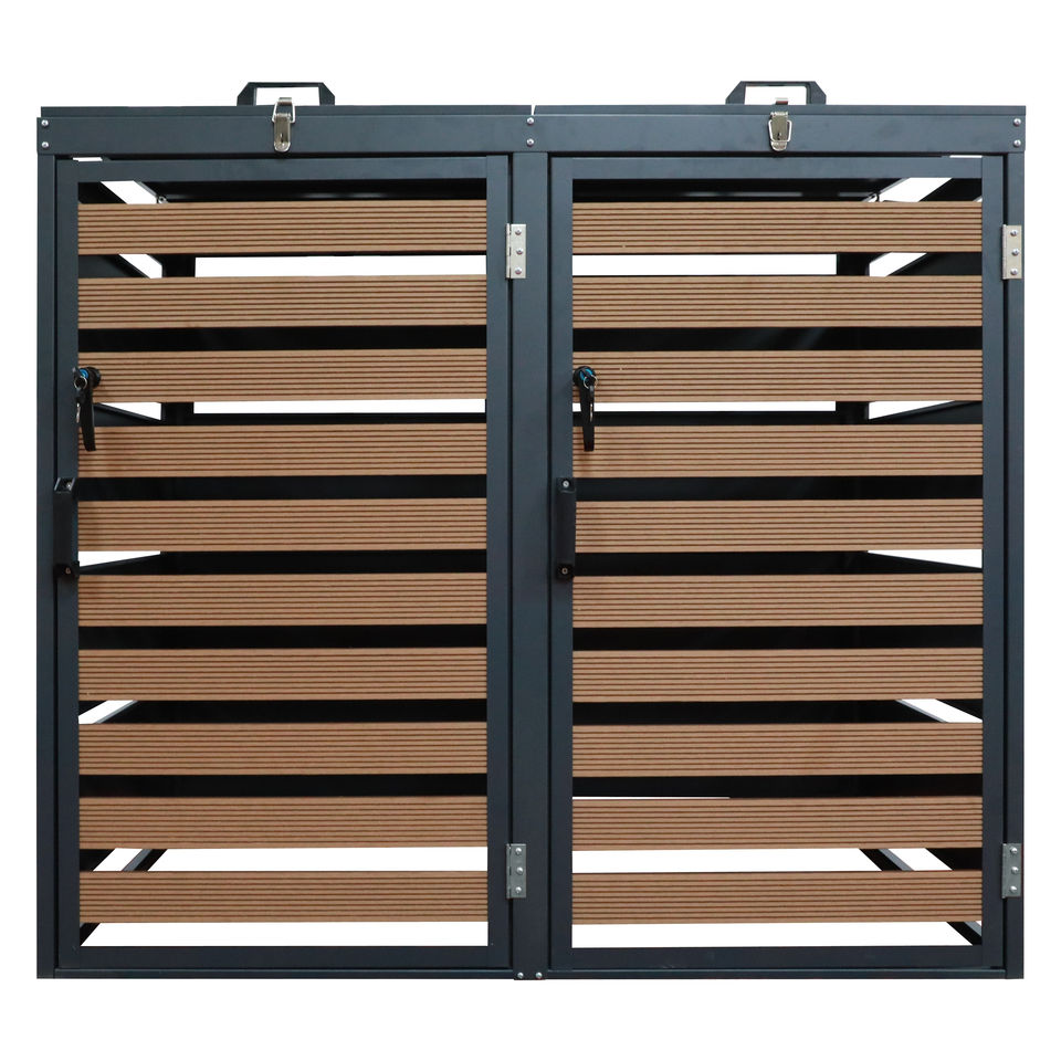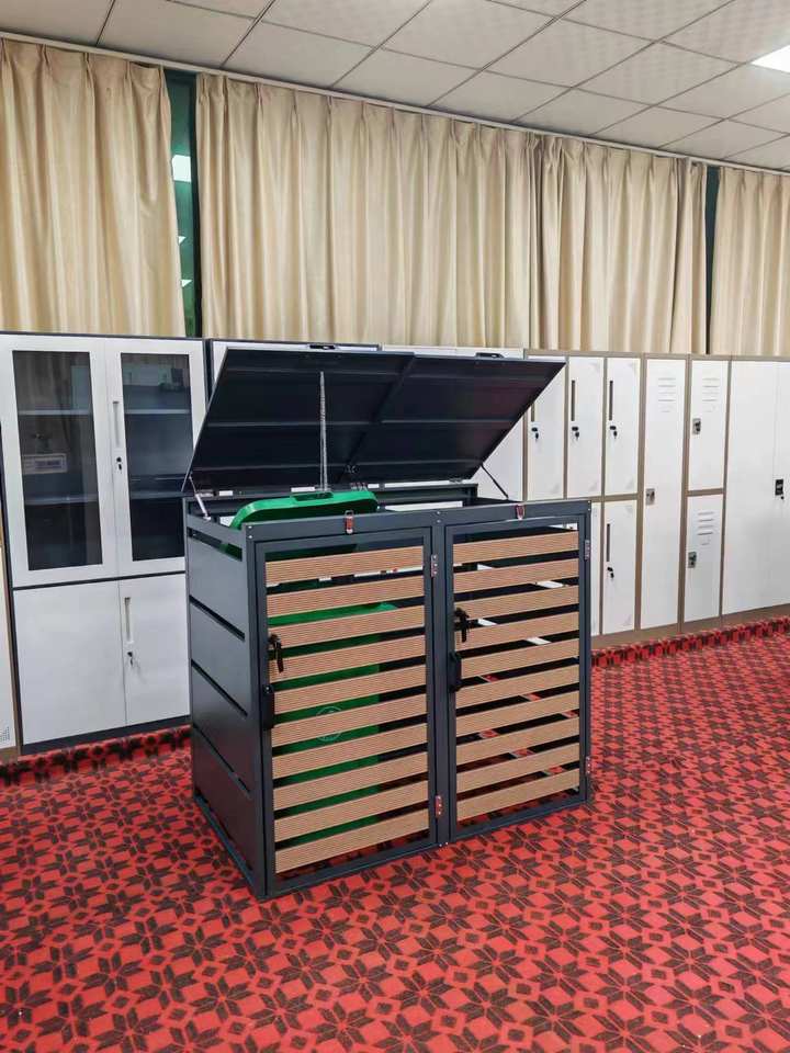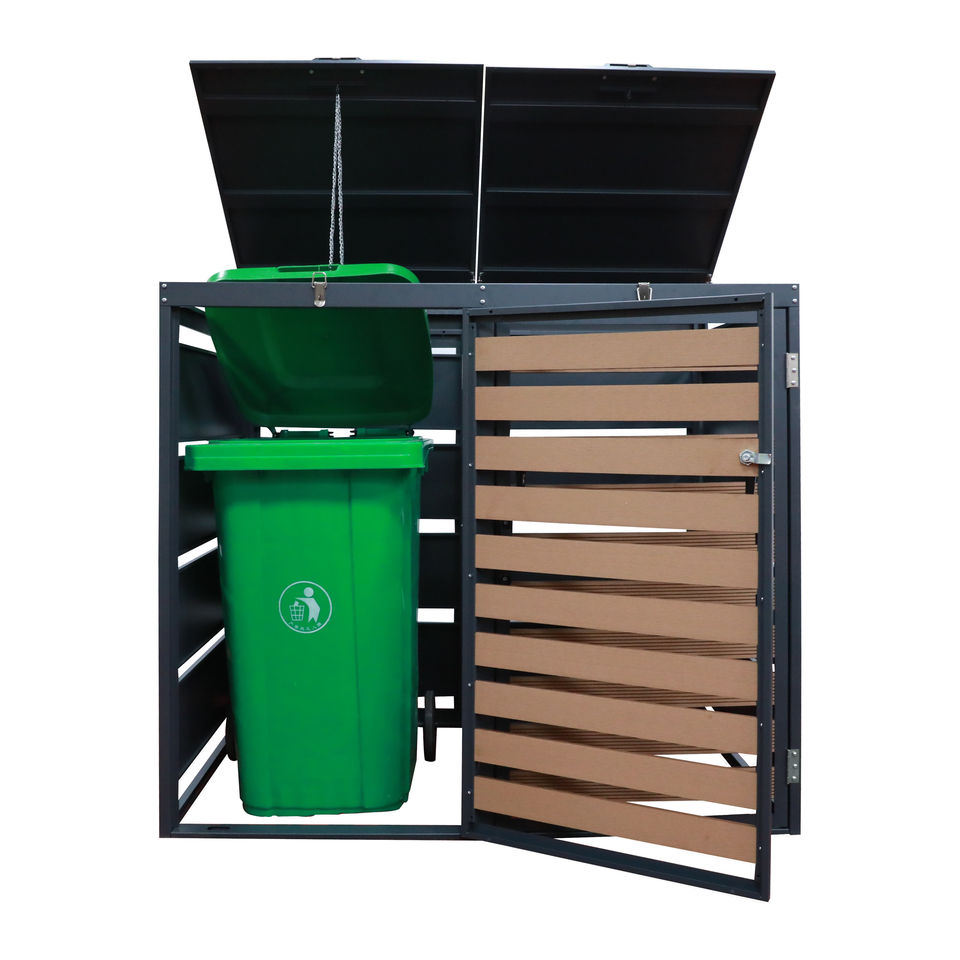 Práctico al aire libre personalizado efectos de madera cubo de basura gabinete acero KD estructura 2 puertas cubo de basura caja de cubierta