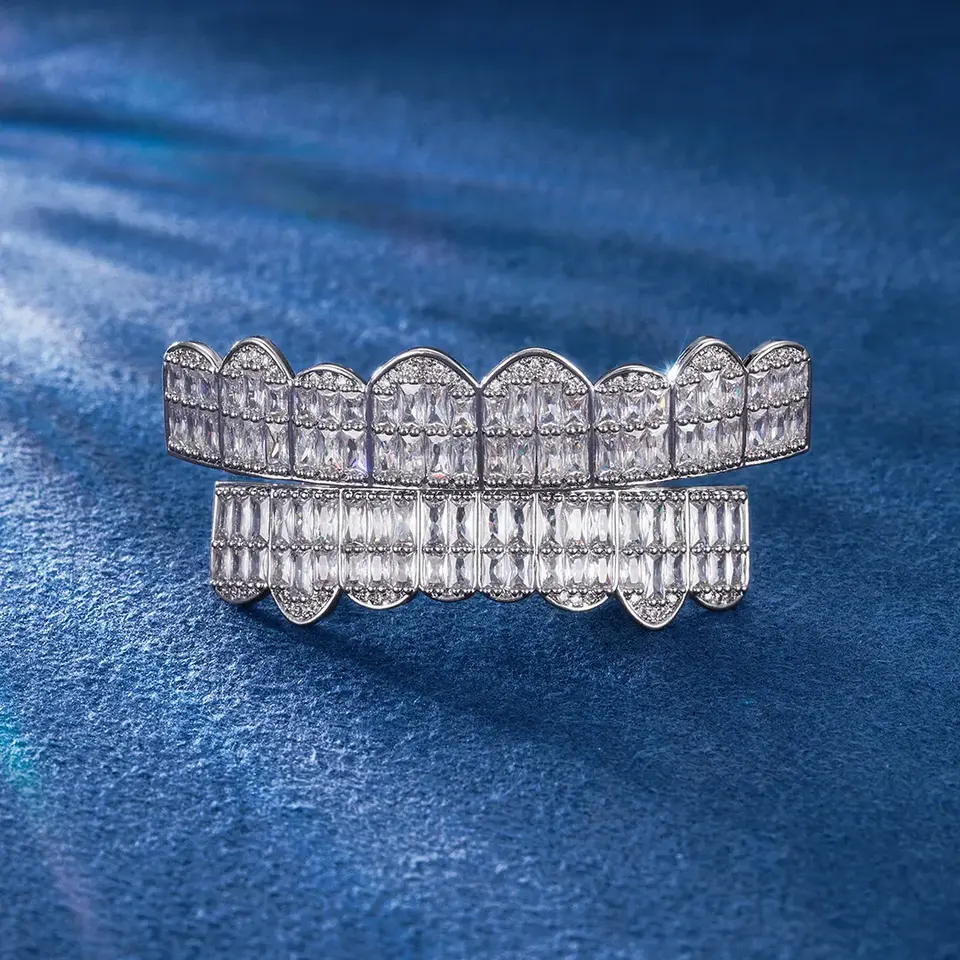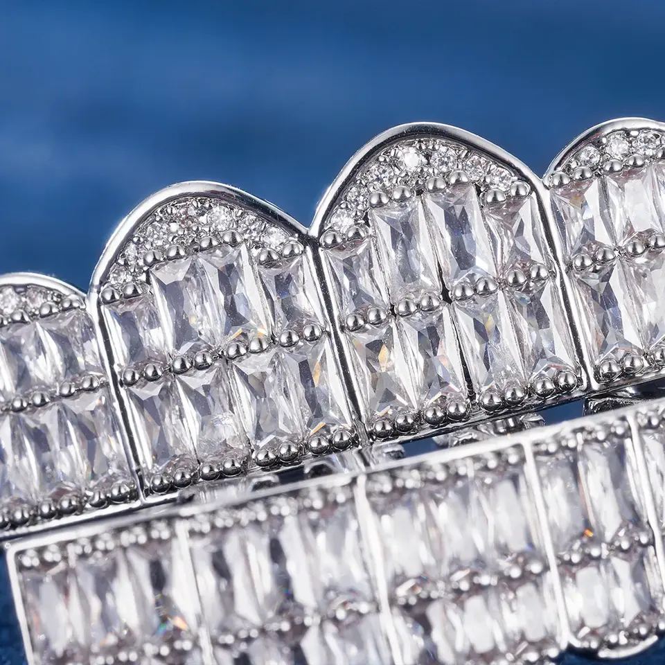 Grillz Pre-fabricados de Plata de Ley 925 con Diamantes Cultivados en Laboratorio, Claridad VVS, Corte Baguette de 16 Dientes, Multitono
