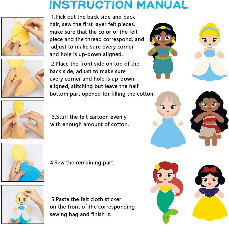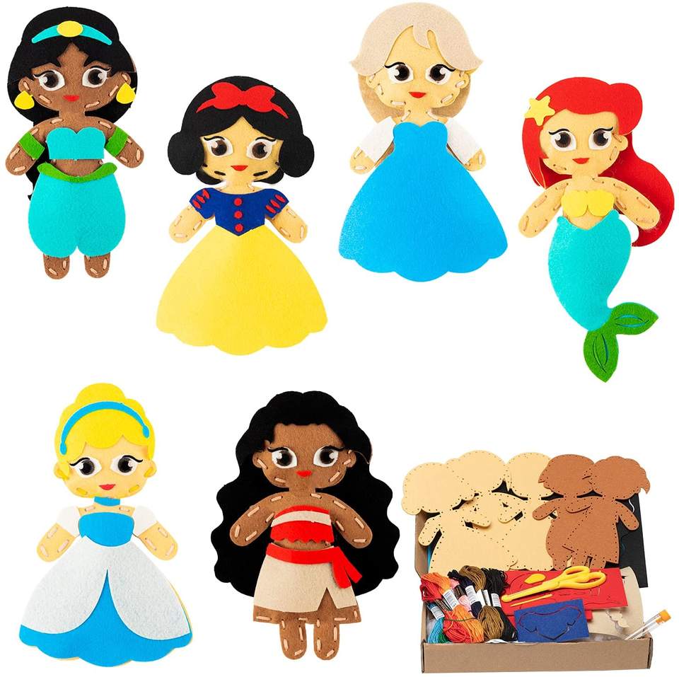 Kit de costura de fieltro precortada para niños, accesorios para manualidades de costura, para aprender a coser, con temática DIY, jasmín, Cenicienta, Elsa, Blancanieves, Moana, Ariel