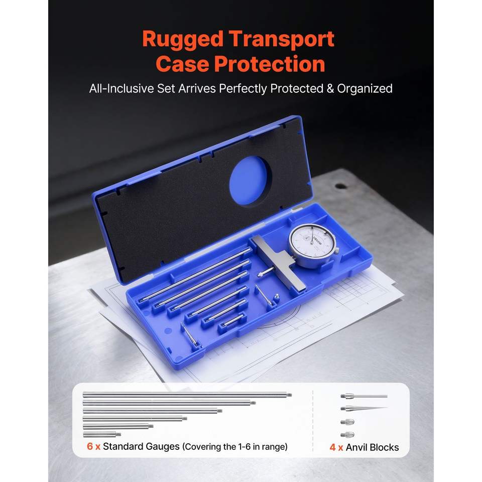 Micrómetro de Precisión EasyT de 0-22 Pulgadas, 4 Yunque, 6 Varillas Estándar, Resolución de 0.001'', Medidor de Profundidad