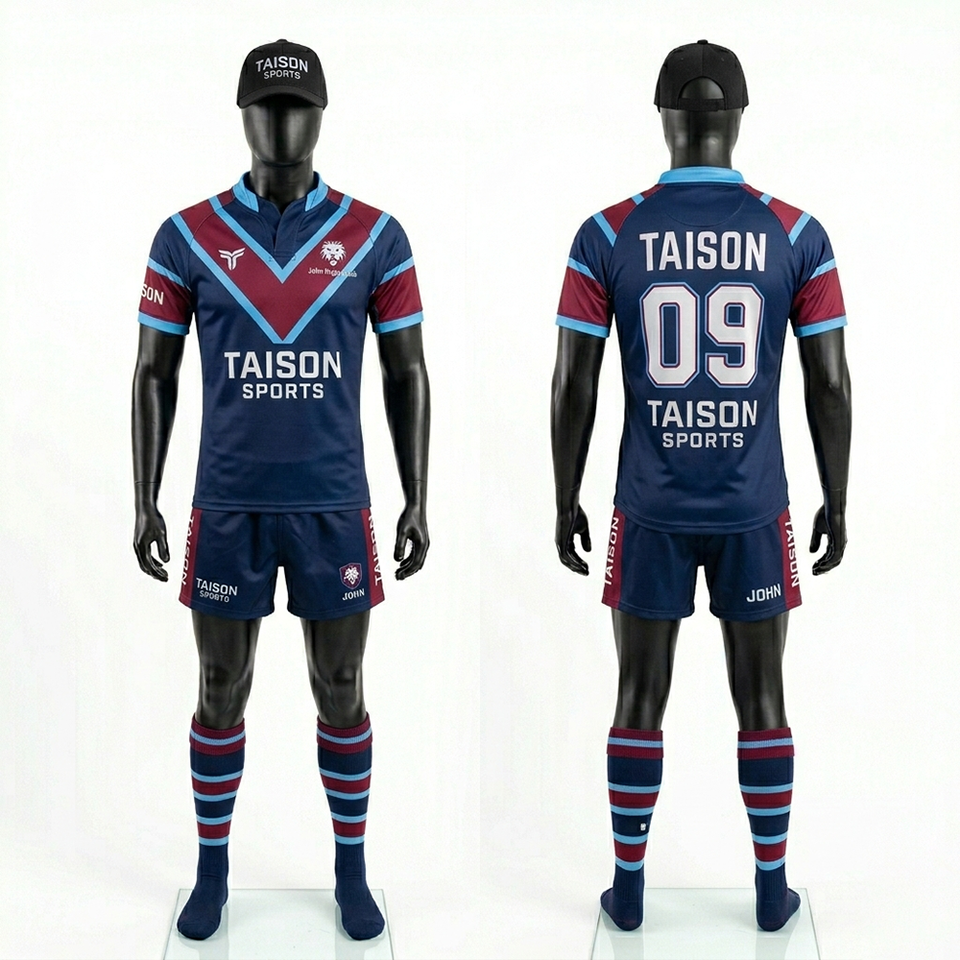 Uniforme de Rugby Premium de Poliéster 180 GSM para Hombre, Transpirable, Azul Marino, Rojo y Blanco, Diseño de Paneles Diagonales, Logotipo Personalizado por Sublimación