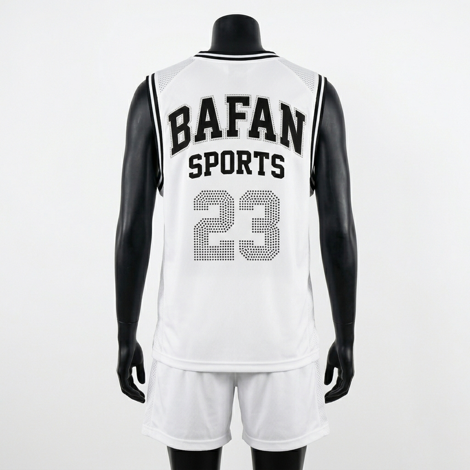 Conjunto de Jersey y Pantalones Cortos de Baloncesto de Malla de Poliéster Premium de 190 GSM, Blanco con Paneles con Ribete Negro, Logotipo Personalizado con Pedrería, Conjuntos para Mujer