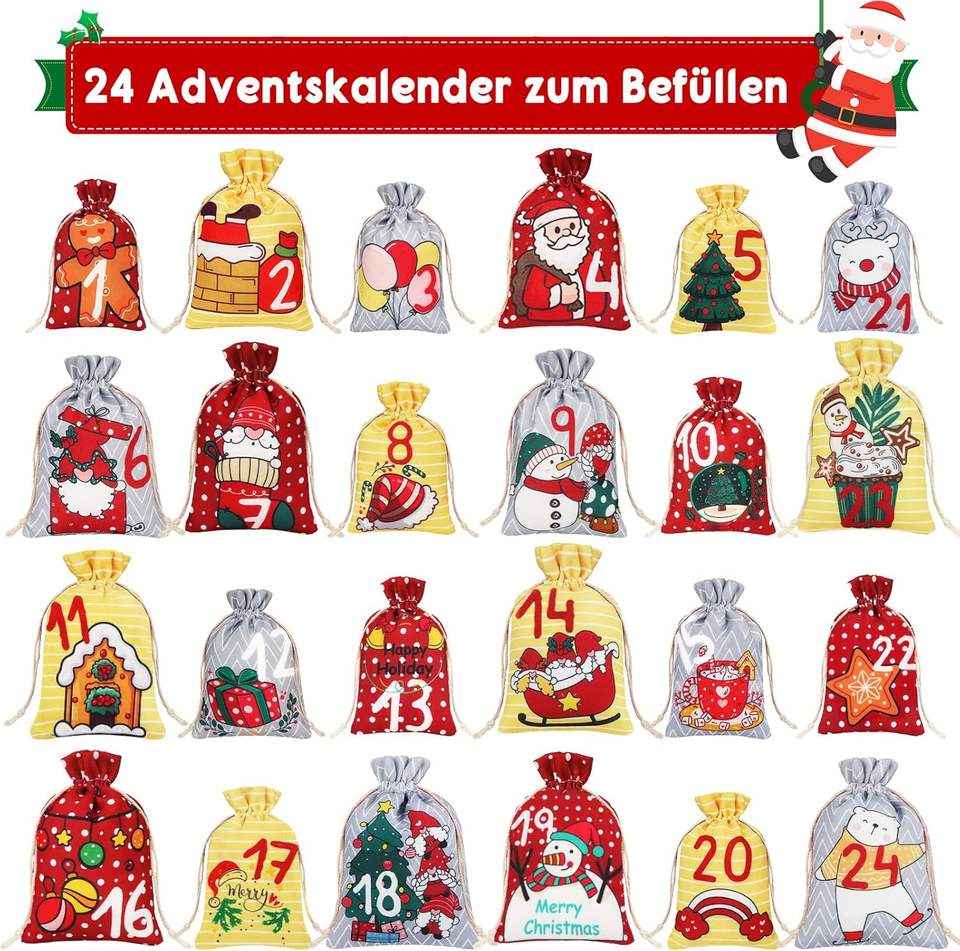 Premium 24 piezas reutilizable ecológico DIY Navidad Adviento calendario bolsa de tela Santa Claus media en forma de decoraciones colgantes