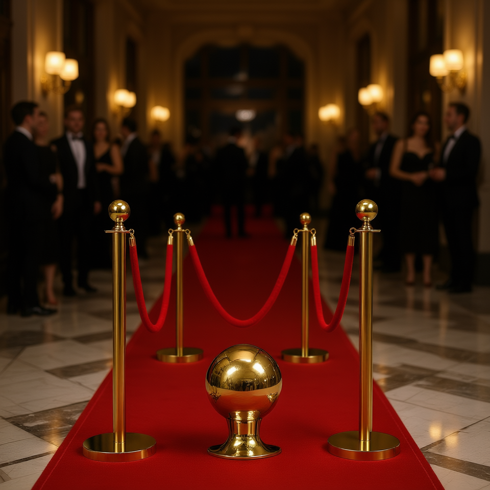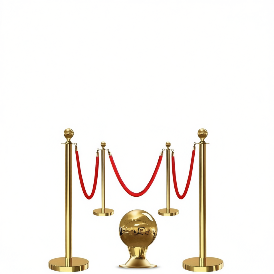 Juego de Postes Delimitadores Dorados de 4 Patas con 3 Cuerdas de Terciopelo Rojo y Puntas Esféricas de Acero Inoxidable para Eventos y Fiestas
