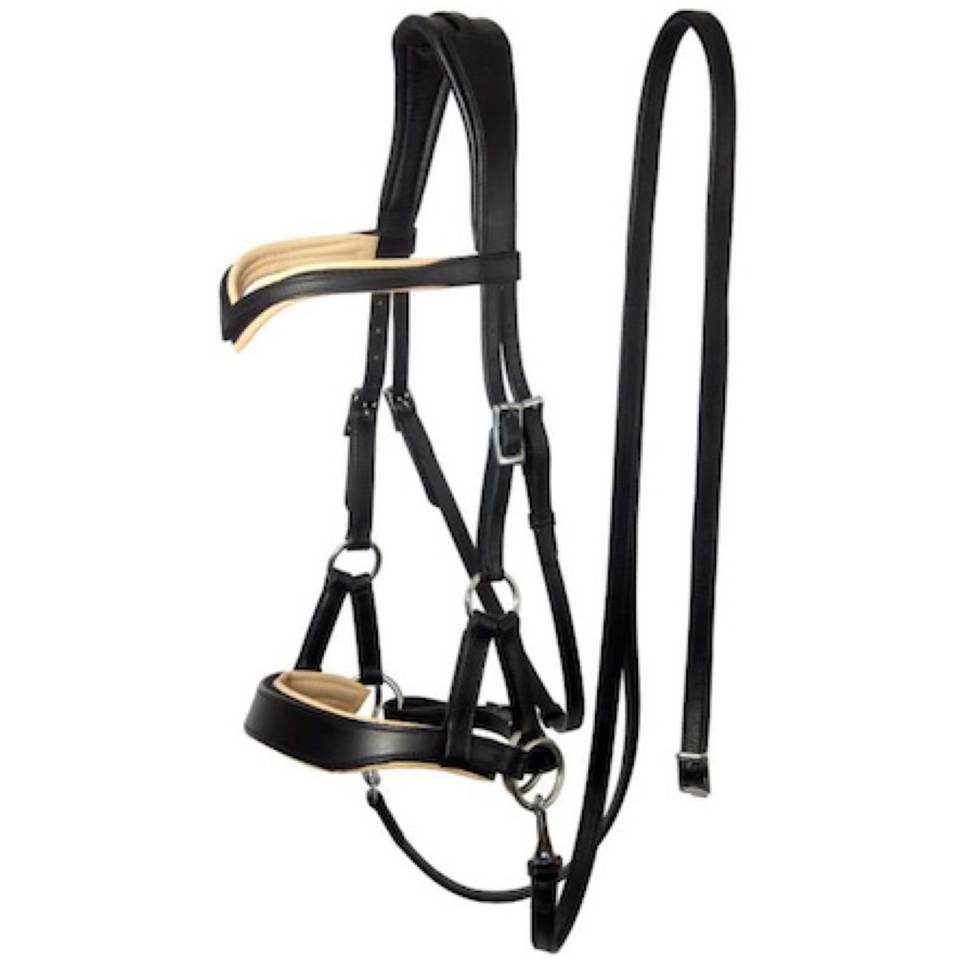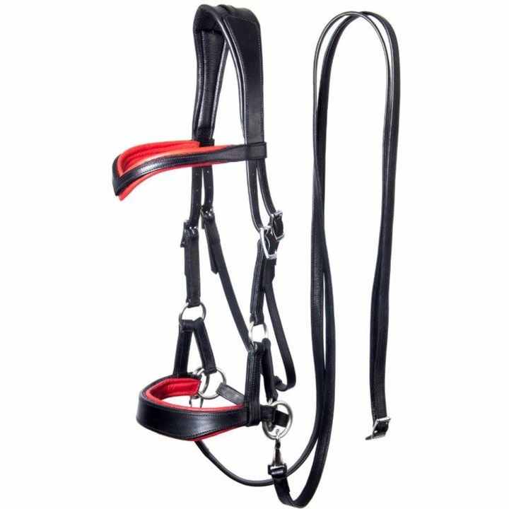 Brida Anatómica Premium Multifuncional para Salto Ecuestre, Negra y Roja, Acolchada, con Riendas