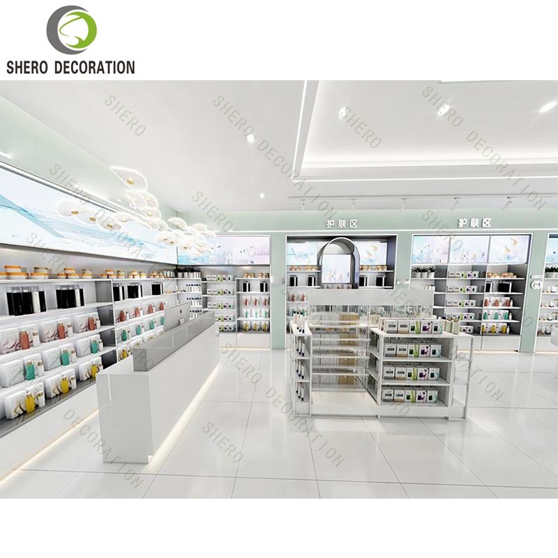Escaparate de exhibición de cosméticos personalizado con diseño de espacio minorista de belleza Premium, soporte de exhibición de cosméticos moderno para decoración de interiores de tienda