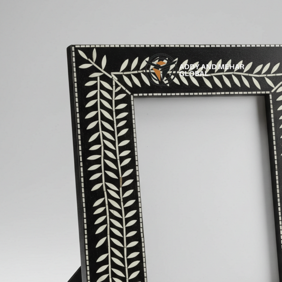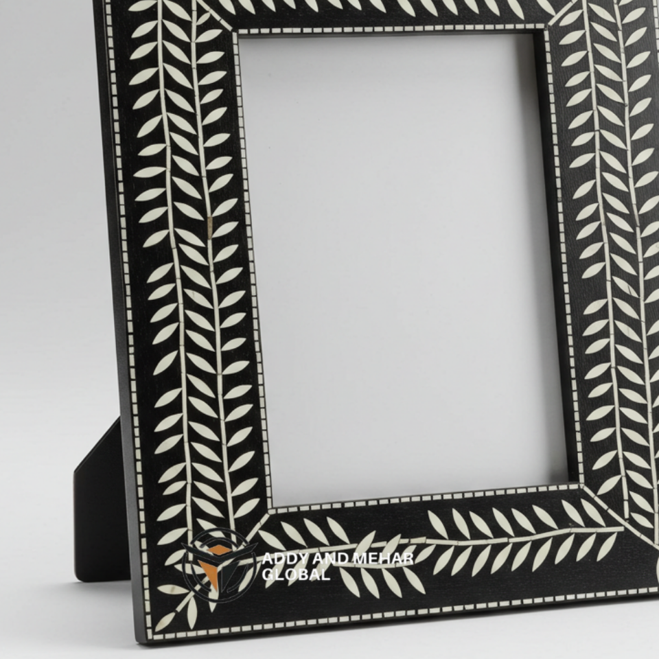 Marco decorativo con incrustaciones de hueso negro Premium, mosaico hecho a mano, detalles de rayas para una decoración elegante