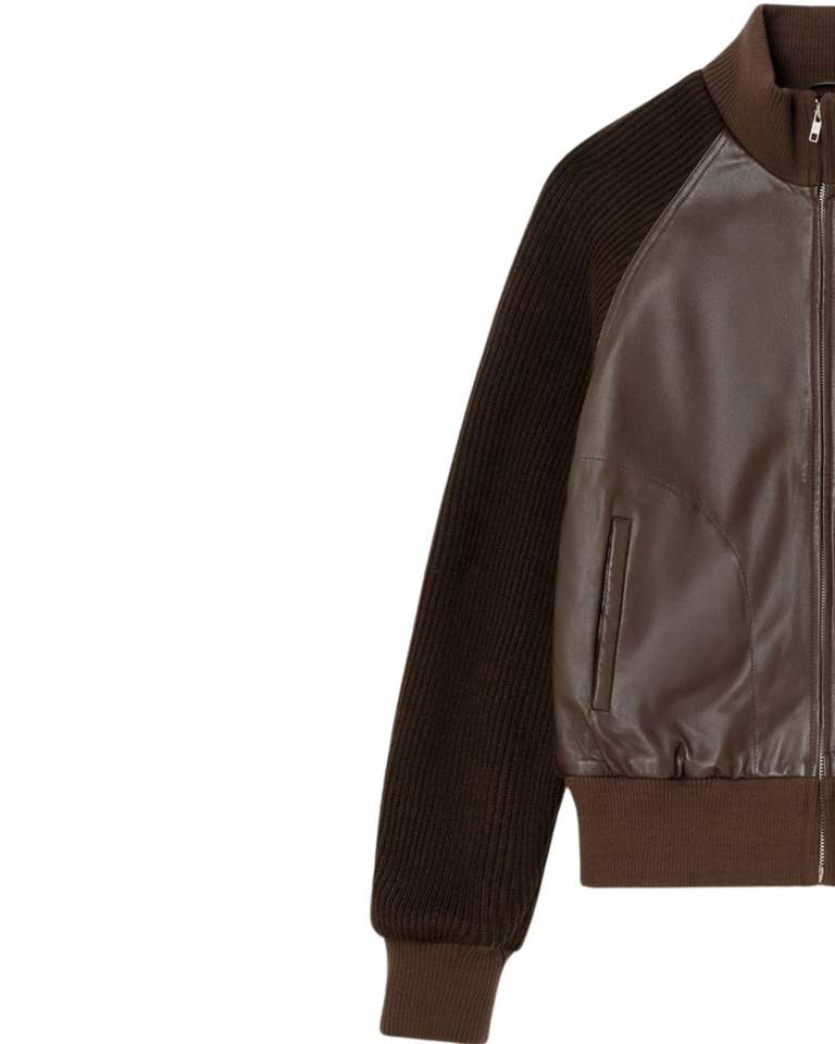Chaqueta de Punto con Cierre y Mangas de Cuero Sintético Marrón Chocolate Premium para Hombre, Cuello Acanalado, Ropa de Abrigo Informal de Invierno, Abrigo de Moda, Ropa Masculina