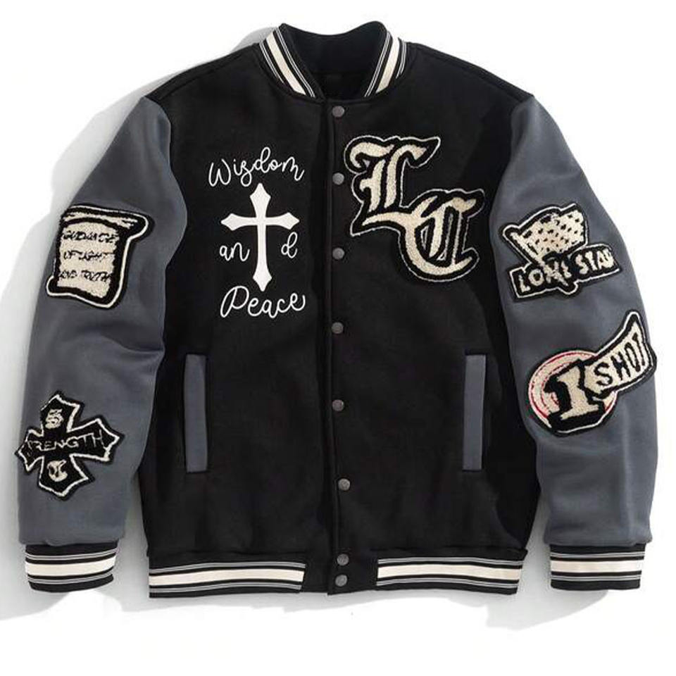 Chaqueta de béisbol universitaria Premium para hombre, dos tonos, 100% algodón, sensación de cuerpo, mangas grises, clásico, Varsity, con capucha, prendas de vestir exteriores delanteras, Invierno