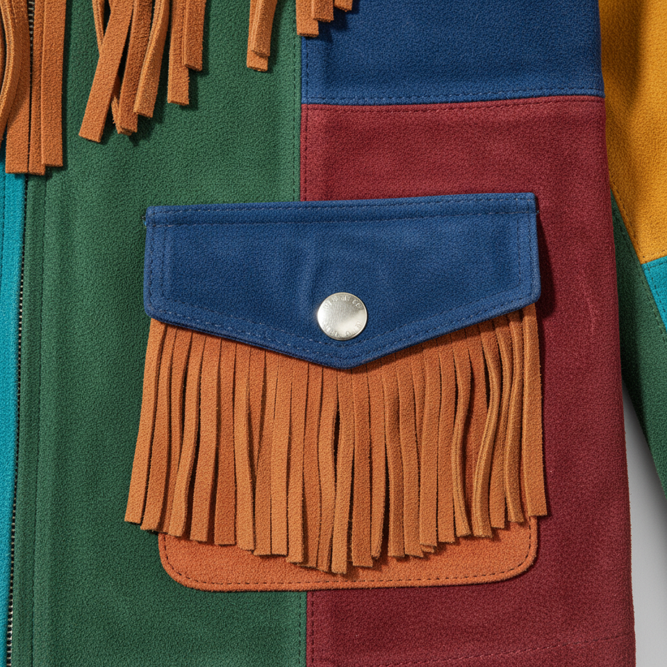 Chaqueta de cuero de gamuza con flecos estilo western, panelada y colorida, estilo bohemio.