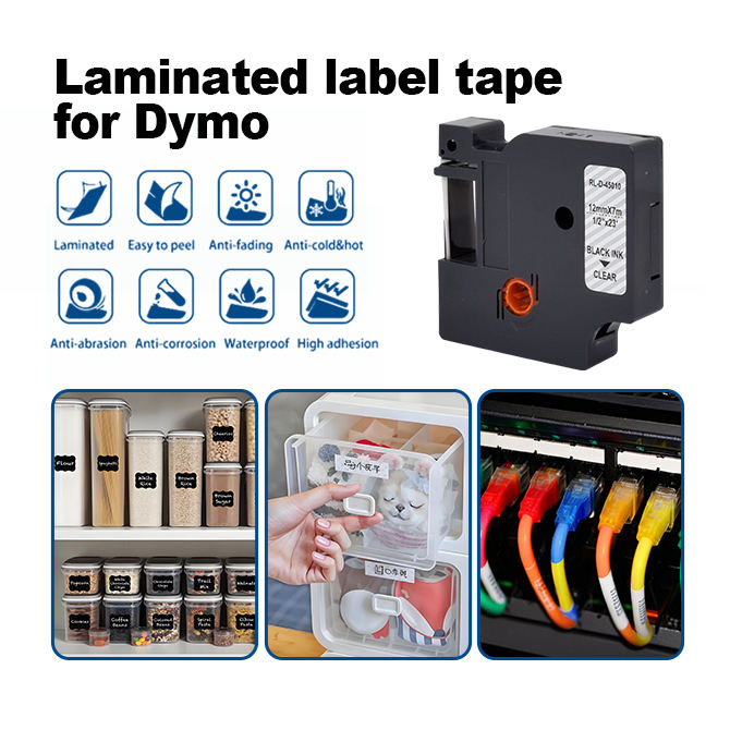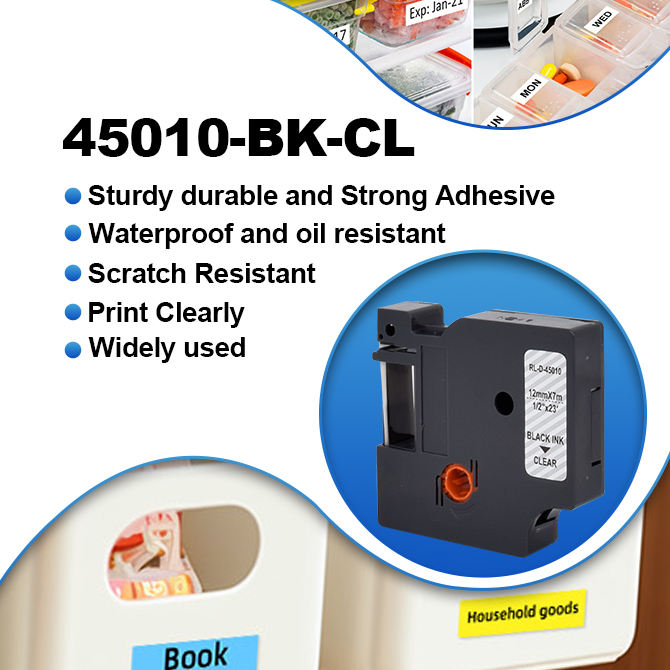 Cinta de Etiquetas Compatible Premium 45010 de 12 mm x 7 m, Negra Transparente para DYMO LabelManager 210D/260P/280/360D, Resistente al Agua y al Aceite