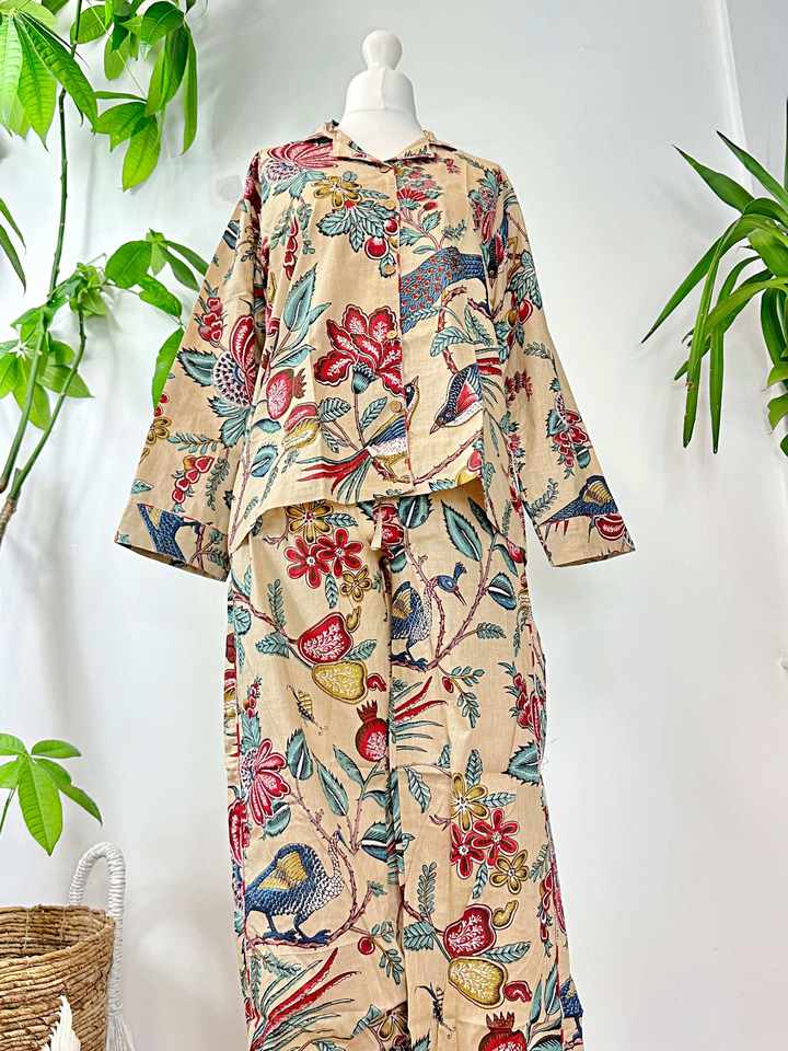 Conjunto de pijama de algodón Premium para mujer, estampado a mano, estampado de pavo real, pájaro, diseño Floral, ropa de dormir para verano, primavera y otoño