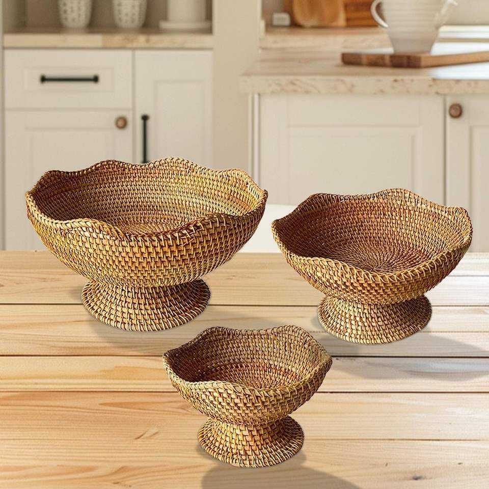 Cuenco de ratán elaborado de primera calidad para mesa de comedor rústica, almacenamiento de pan para servir frutas y exhibición de cocina sostenible decorativa
