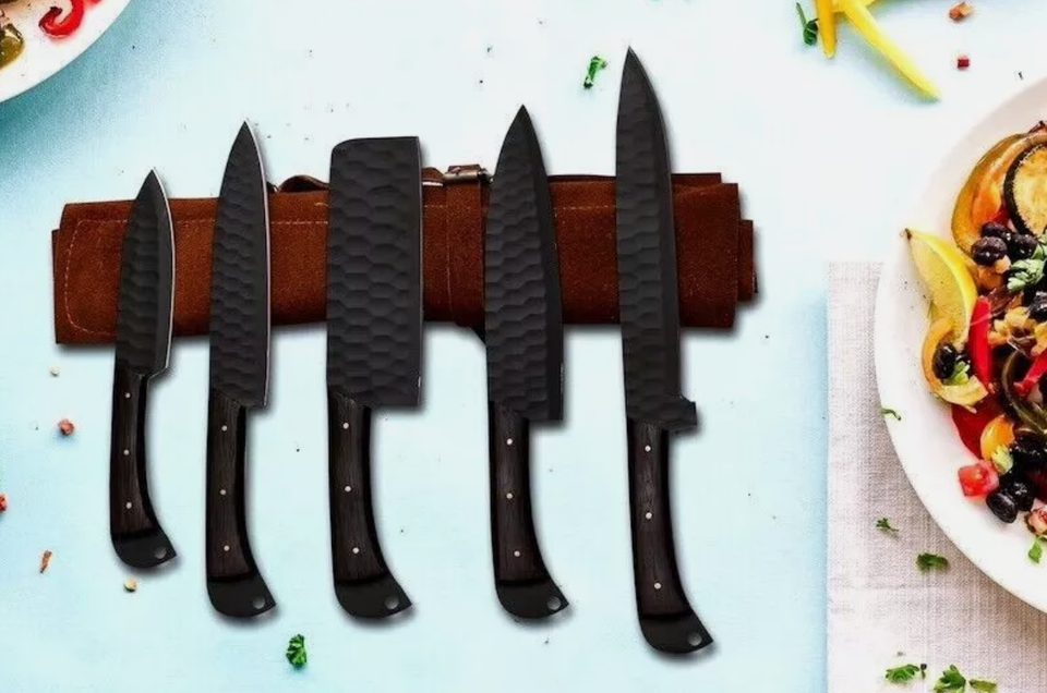 Juego de cuchillos de chef de acero al carbono forjado personalizado de primera calidad, cuchillos de cocina hechos a mano con Funda de cuero puro, 5 uds.