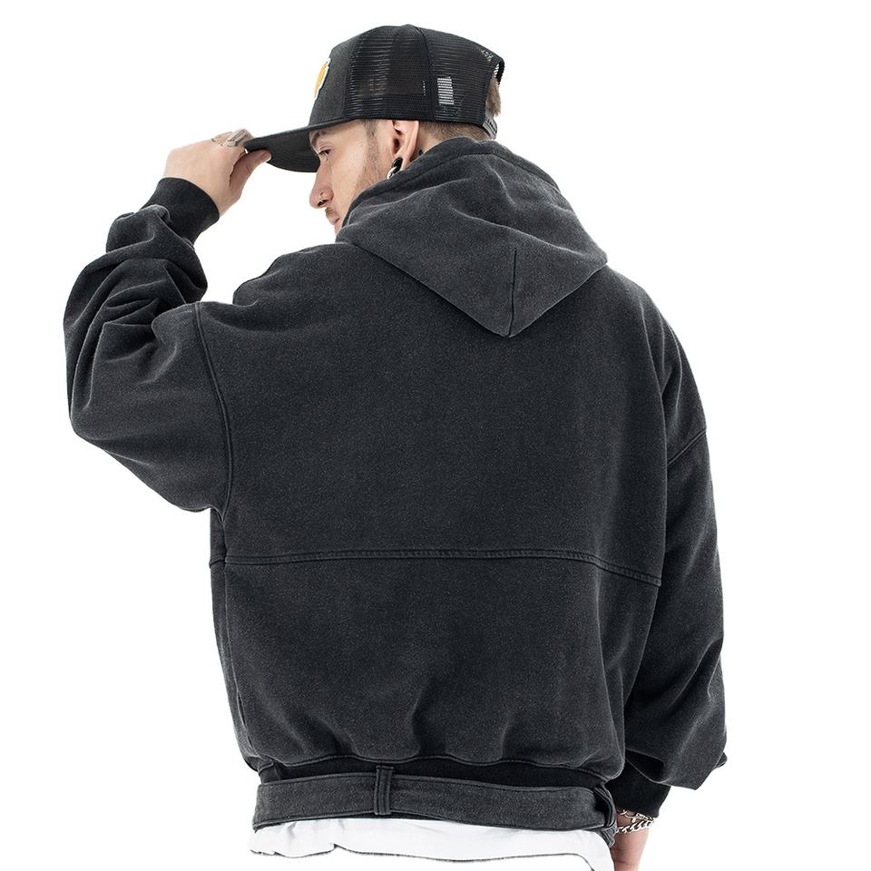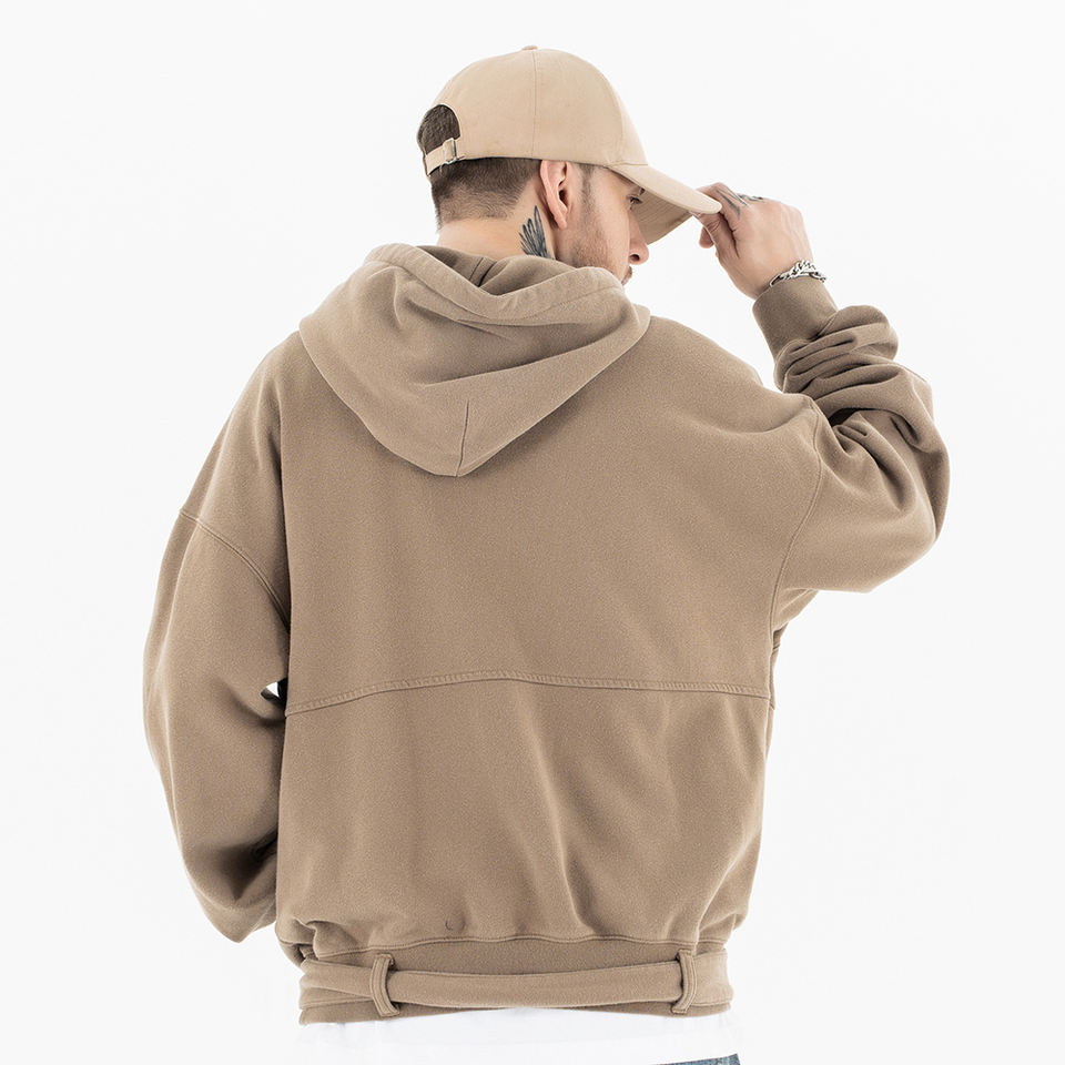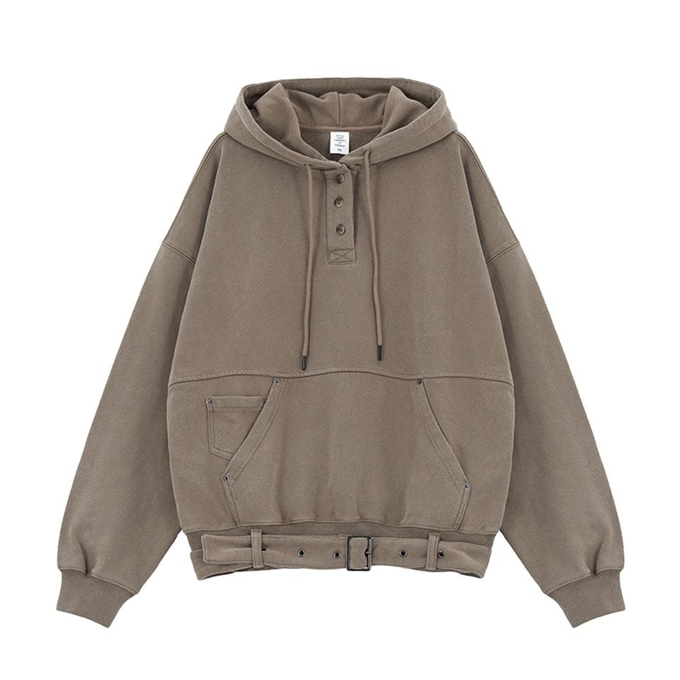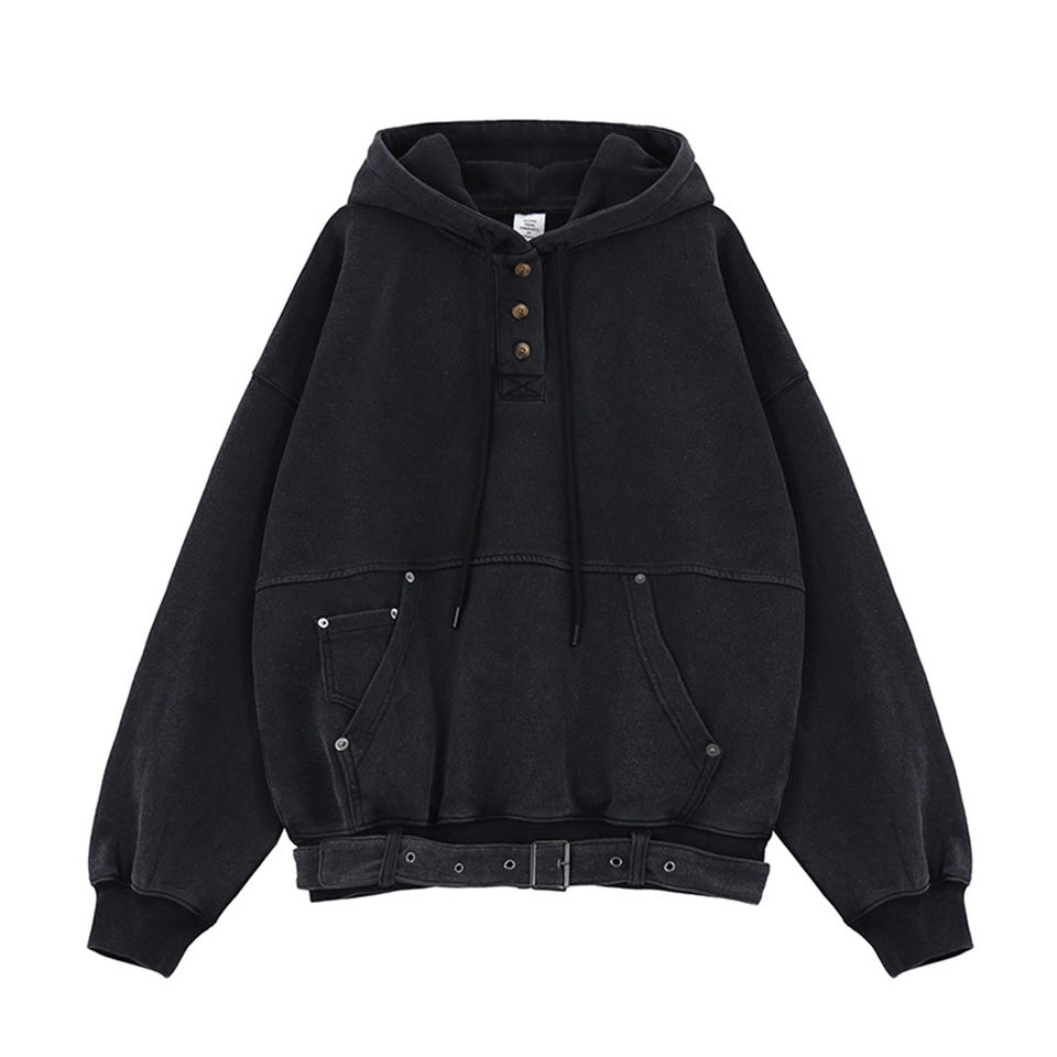 Premium Deconstructed Patchwork Rivet Hoodie Vintage Button Belted Hem Pocket Hoodie 60% algodón 40% poliéster Heavyweight Hoodies