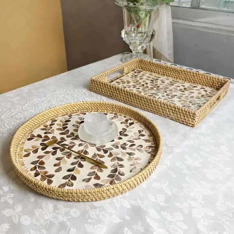 Bandeja Rectangular de Ratán con Madreperla, Diseño Premium, Hecha a Mano, Ecológica, Apta para Lavavajillas, Duradera, Pulida, Moderna, para Fiestas