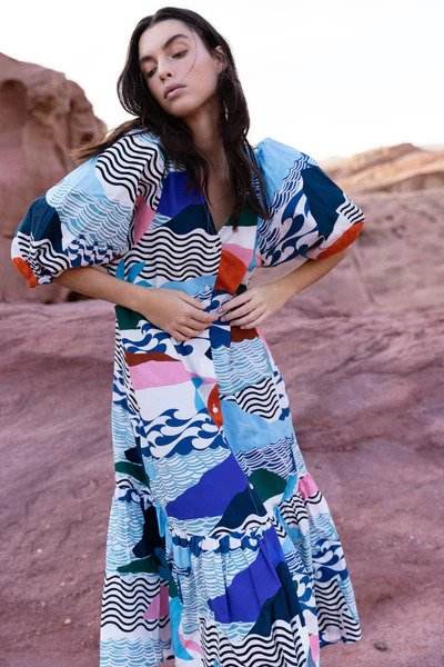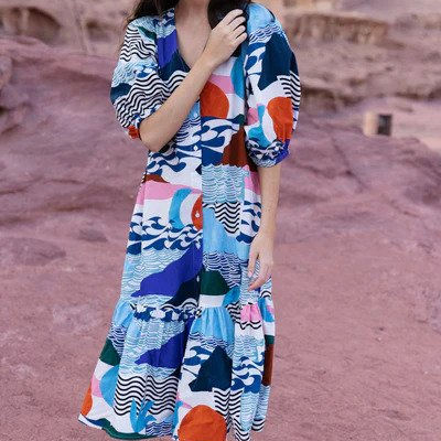 Nombre:Bloque de mano de algodón printerd vestido largo casual