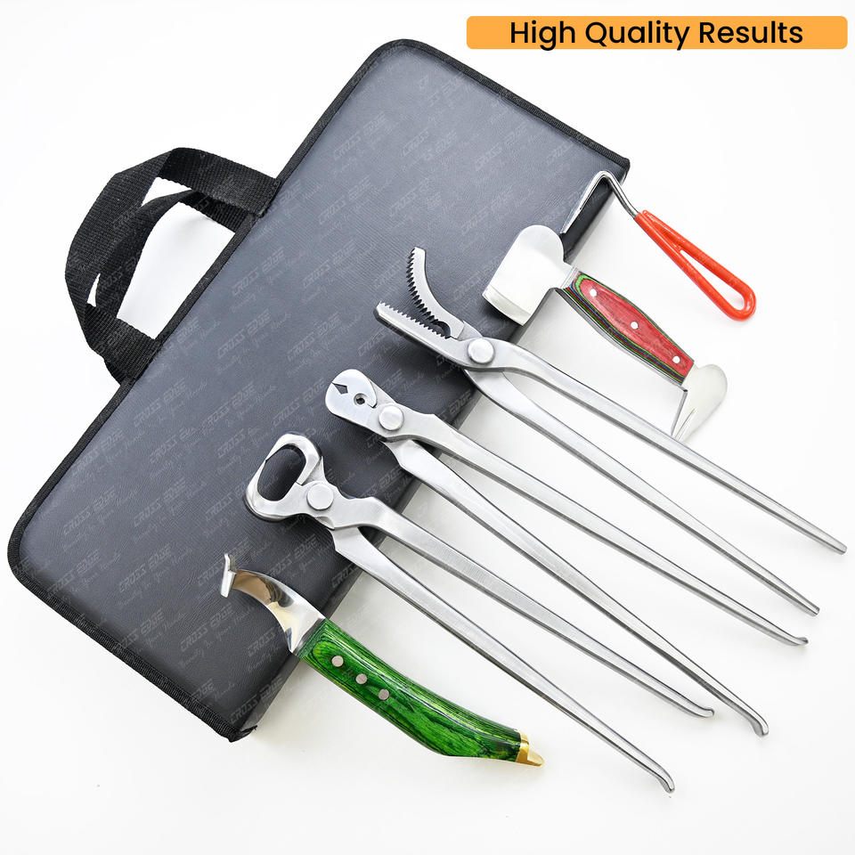 El kit de herramientas Premium para herradores incluye remachador de pezuña de mandíbula curvada forjada por caída, pinzas para uñas, cuchillas afiladas rectas, selección básica de pezuña
