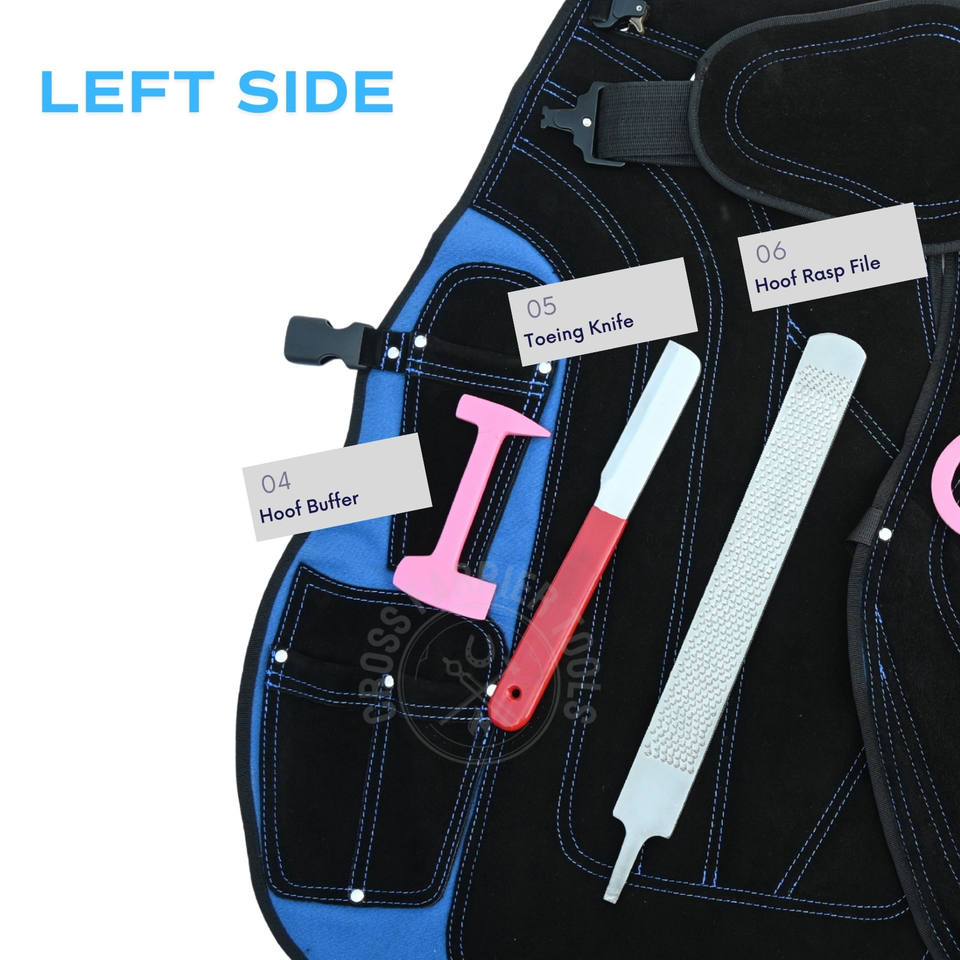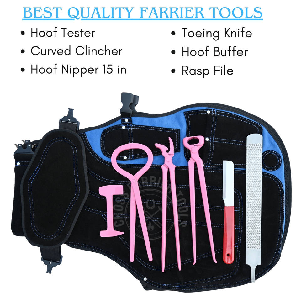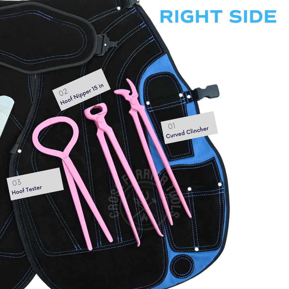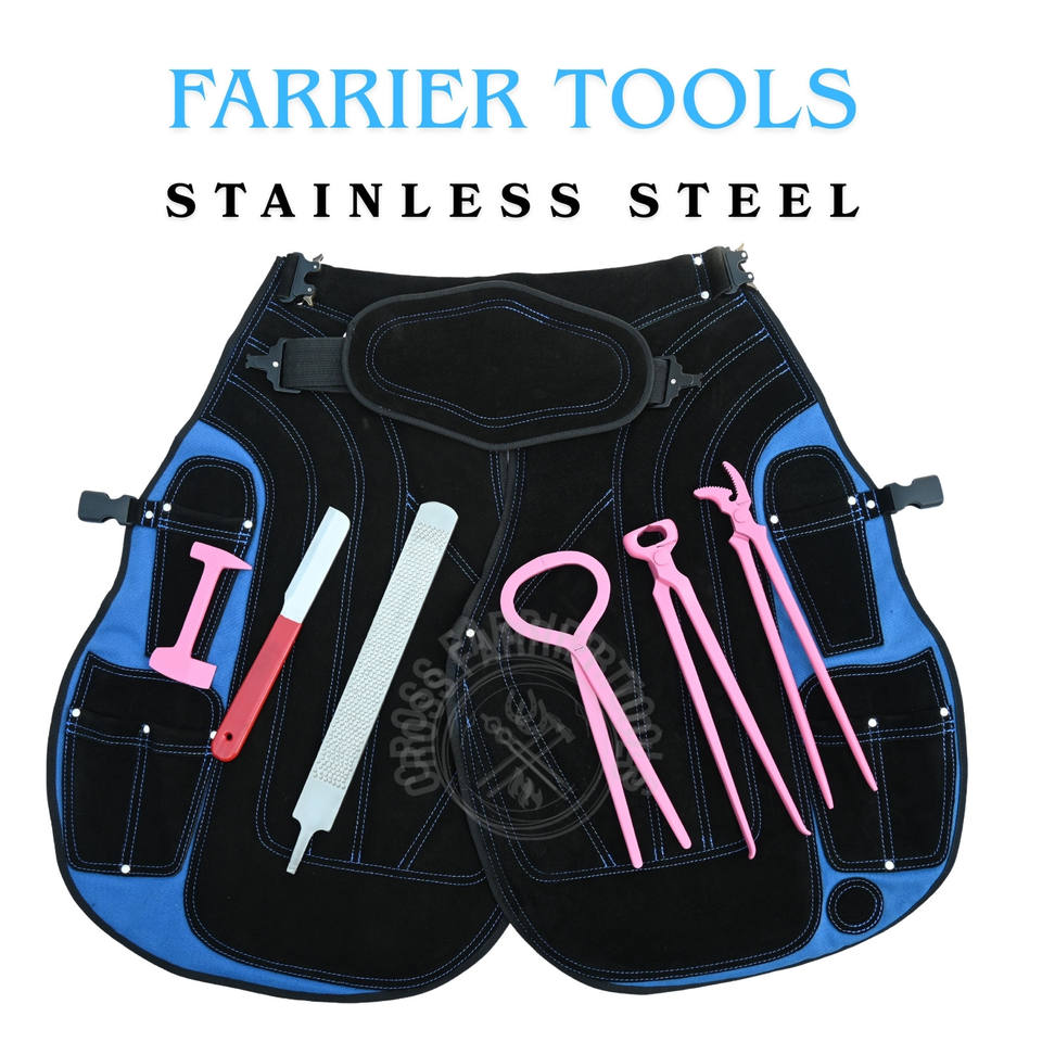 Juego de Herramientas Premium para Herrador: Lima, Probador de Pezuñas, Cortaúñas, Delantal de Cuero Completo, Alicate Curvo, Pulidor y Cuchillo para Talones