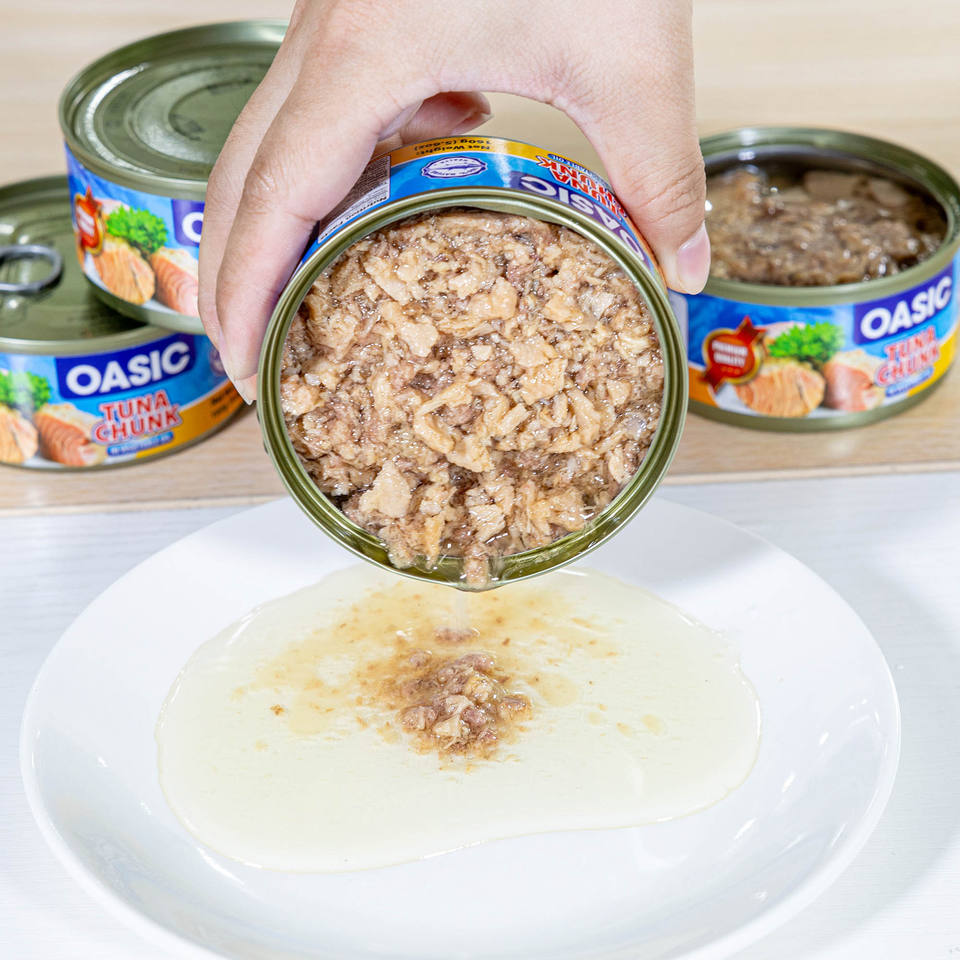 Materia prima fresca de primera calidad, pescado enlatado, trozo de atún enlatado triturado en aceite