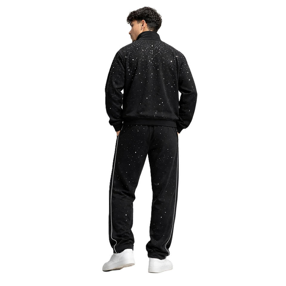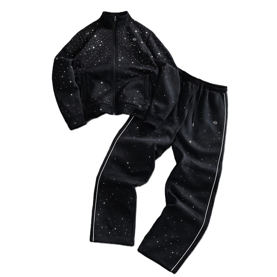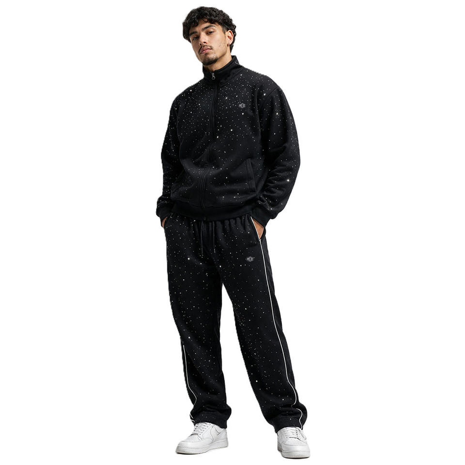 Conjunto de Sudadera con Capucha y Pantalones Jogger de Forro Polar Premium con Cremallera Completa y Pedrería Personalizada, Estilo Lujo Urbano, Proveedor OEM, Venta al por Mayor para Hombre