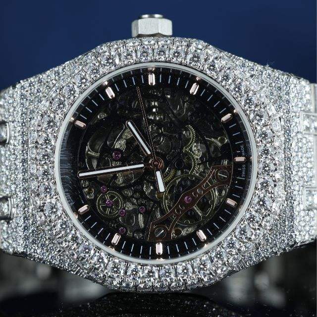 Reloj Automático Premium para Hombre, Totalmente Cubierto de Diamantes, Diseño de Esqueleto | Puntero de Cristal de Zafiro de 16 mm de Acero Inoxidable con Corte de Diamante | Bling de Hip-Hop