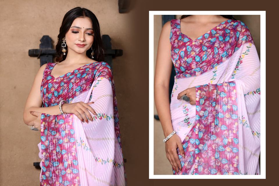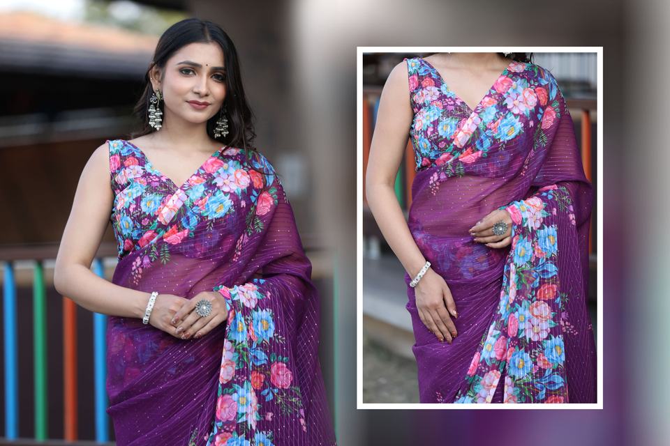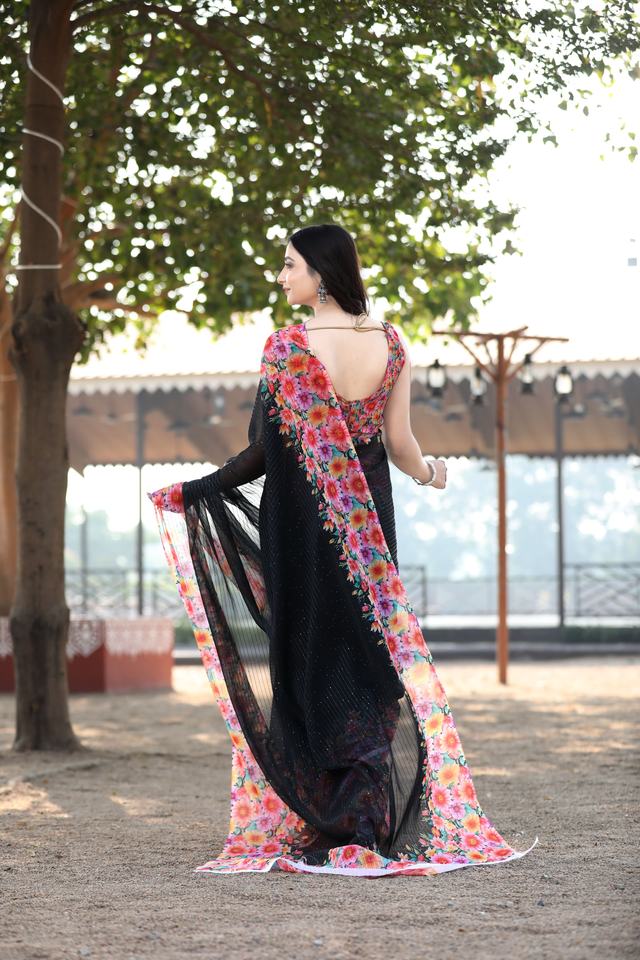 Work:pure Georgette with Crochet 2mm Sequence Work With Digital Print
