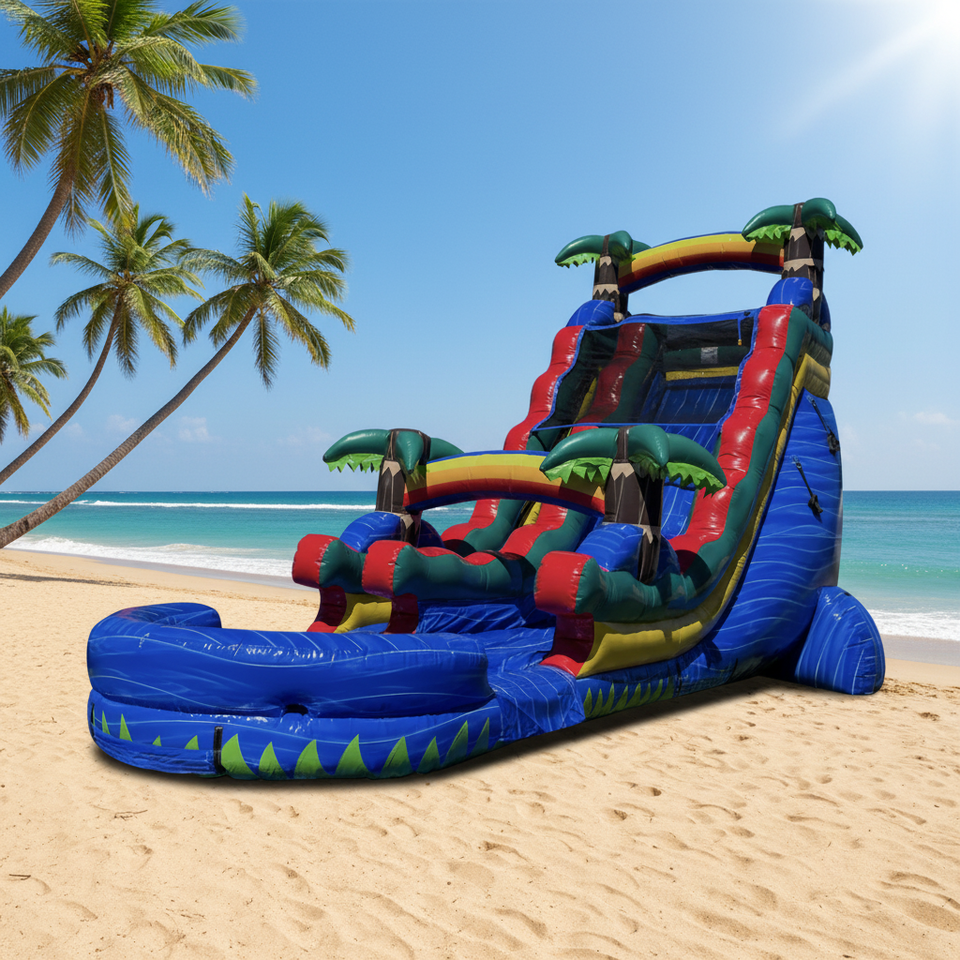 Tobogán Acuático Inflable Gigante Tropical de Doble Carril con Piscina de Chapoteo, Equipo de Juego Acuático para Exteriores de Verano para Adultos y Niños