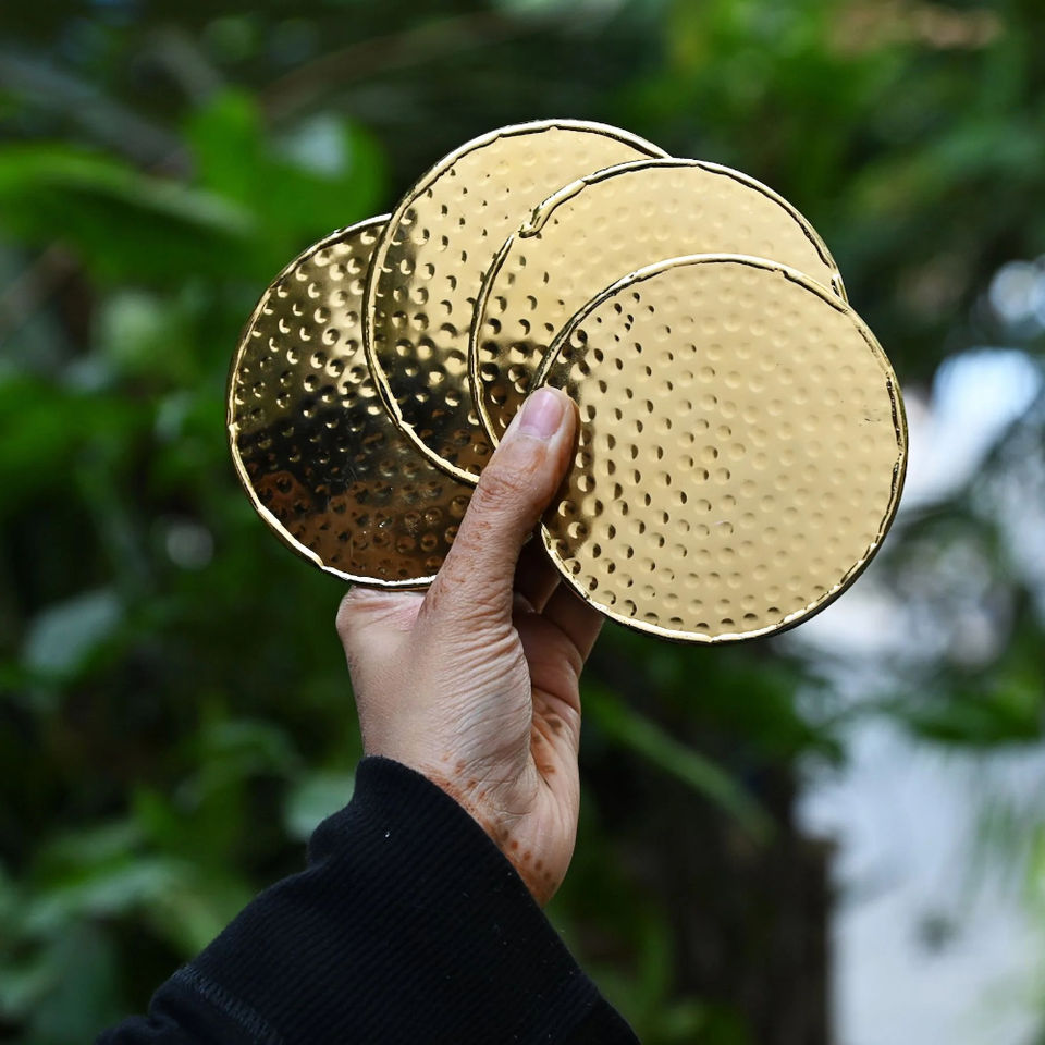 Juego de posavasos de latón martillado de primera calidad para barra de té y café y mesa de comedor, vasos hechos a mano redondos dorados, juego de regalo de decoración del hogar