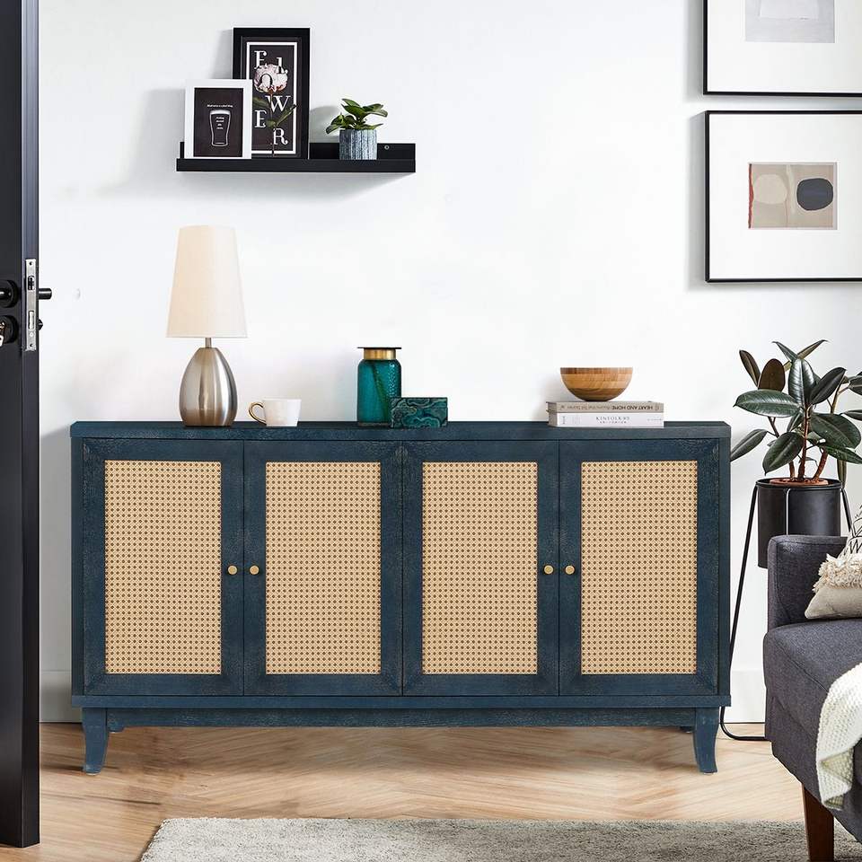 Gabinete de Almacenamiento Premium Hecho a Mano con Paneles de Madera y 4 Puertas de Ratán, Aparador Moderno para Sala de Estar