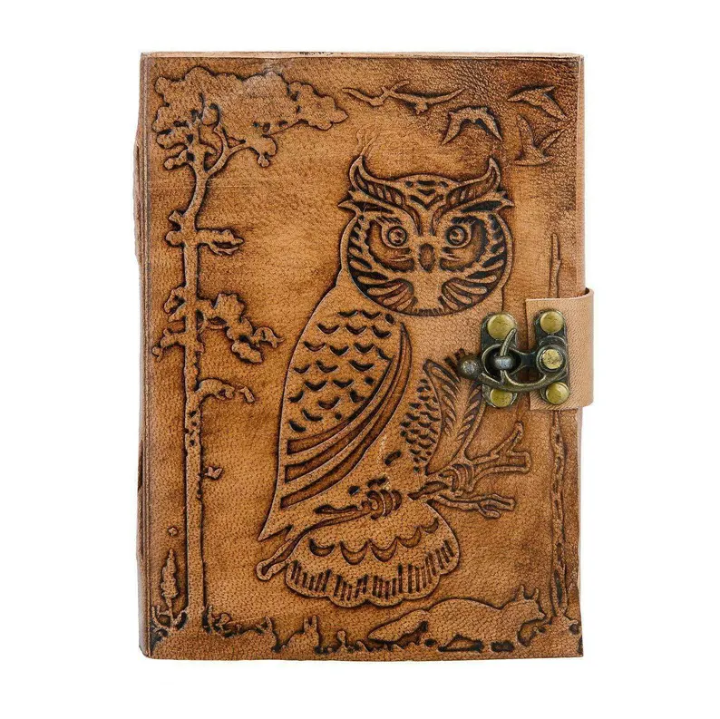 Diario de Tapa Dura de Cuero Grabado a Mano con Diseño de Búho, Libre de Ácido, con Cierre Antiguo y Regalo de Escritura Vintage