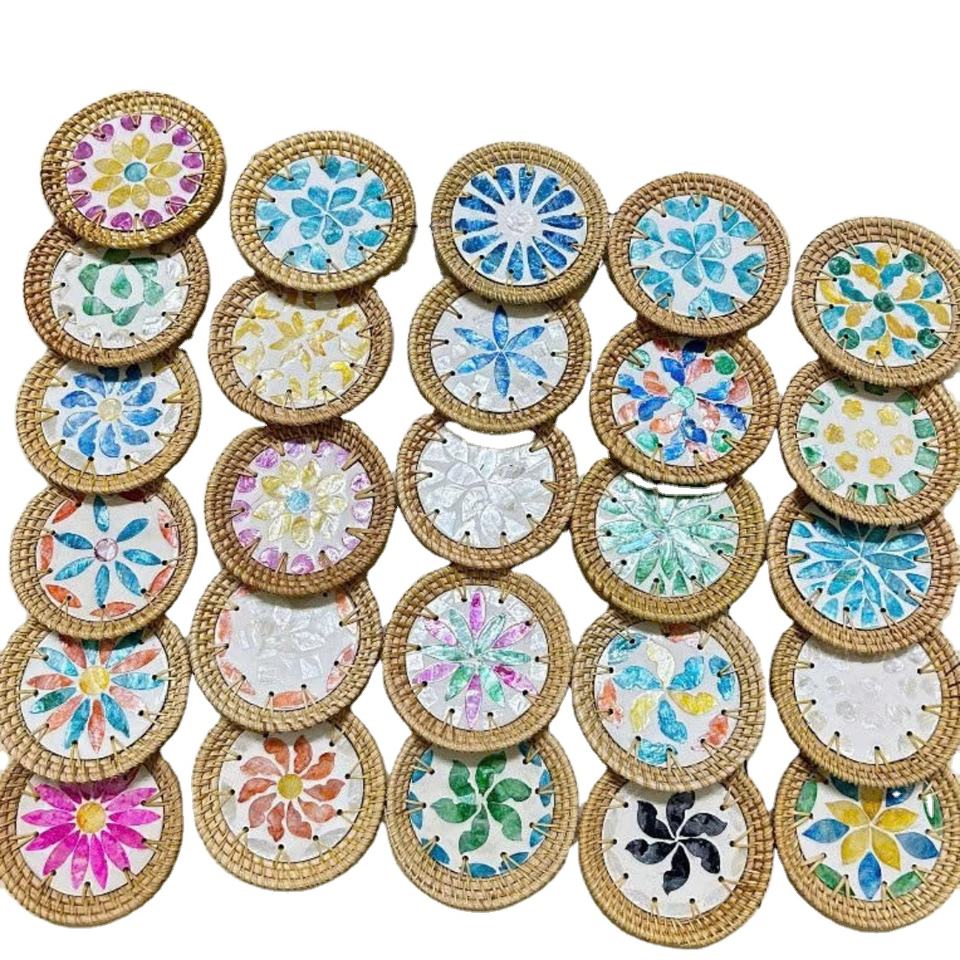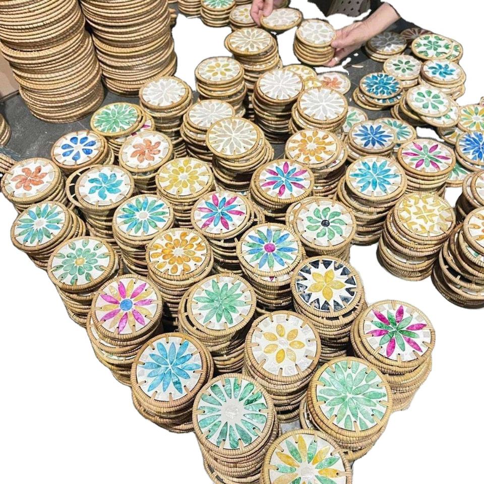 Plato de Cerámica y Ratán Hecho a Mano de Primera Calidad, Posavasos Redondo con Diseño Floral Clásico, Decoración y Regalo para las Fiestas, Hecho en Vietnam